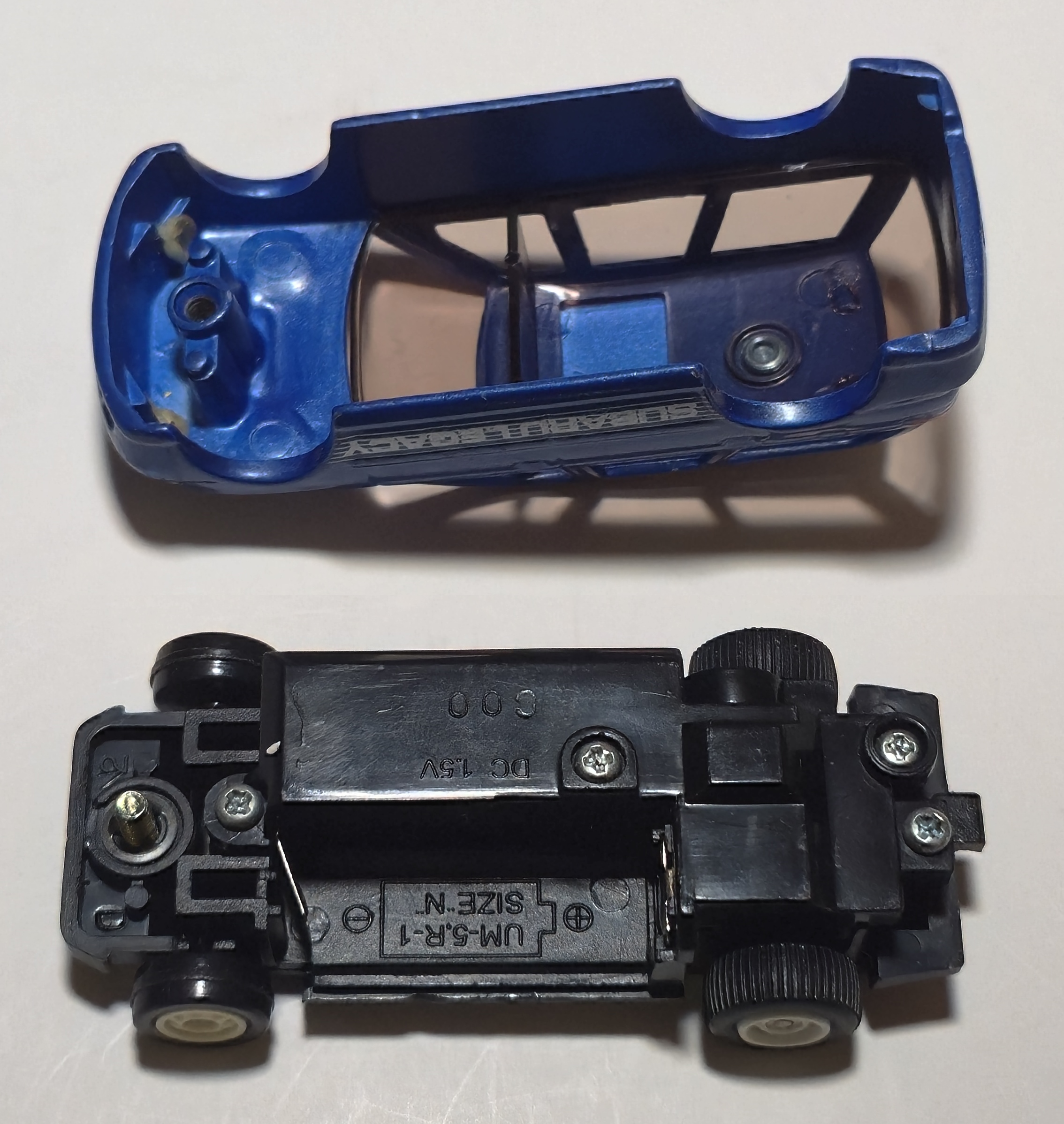This neat red and silver set variant from the 1994 B/O Tomica Basic Set (B/Oトミカベーシックセット) has unfortunately been eaten away inside by a leaking battery.