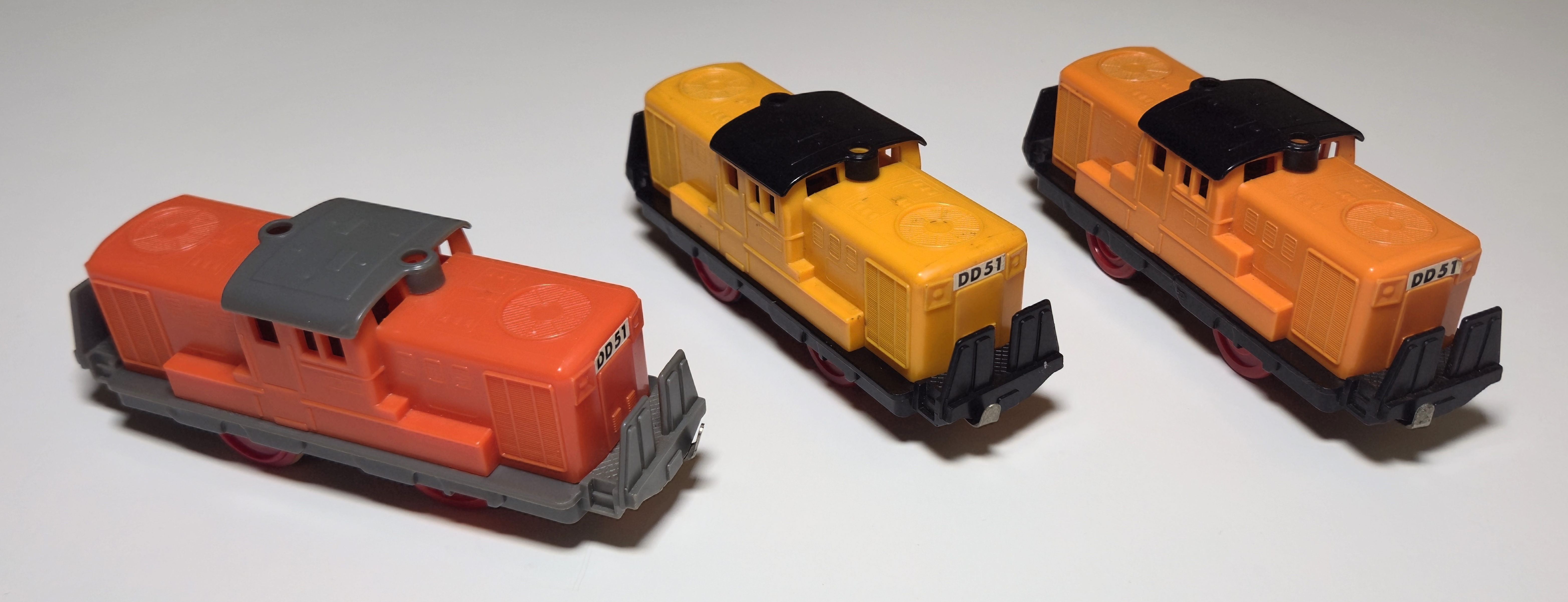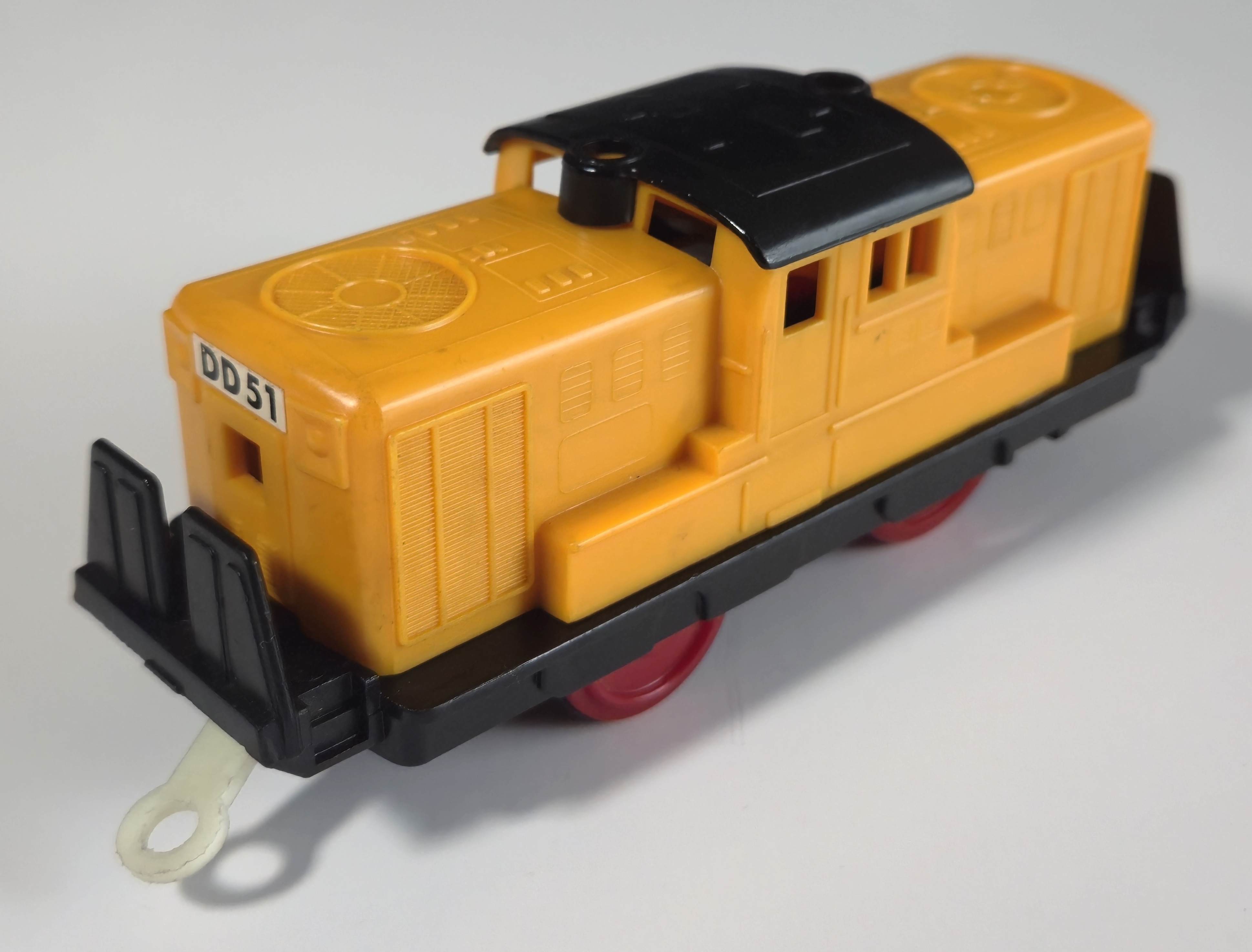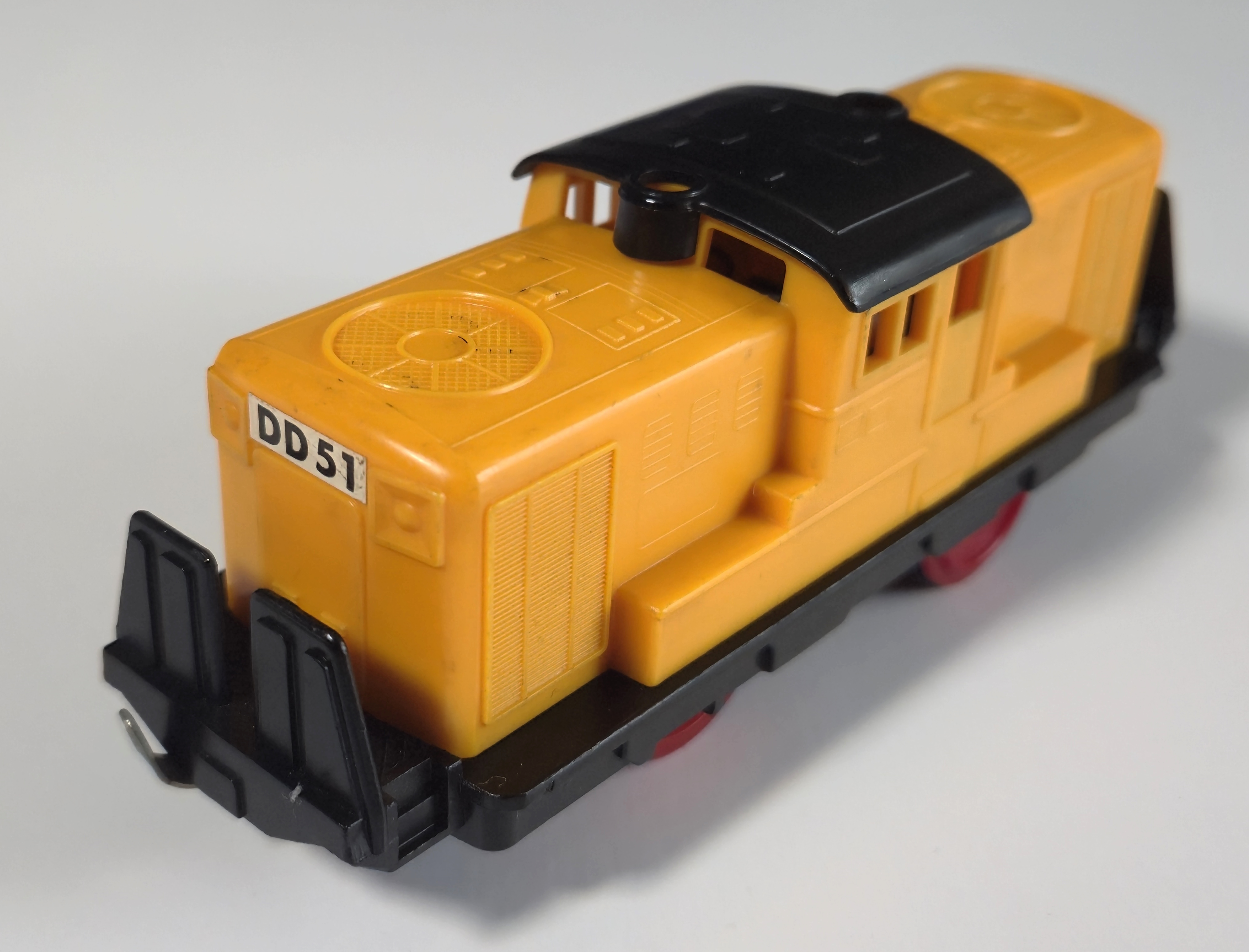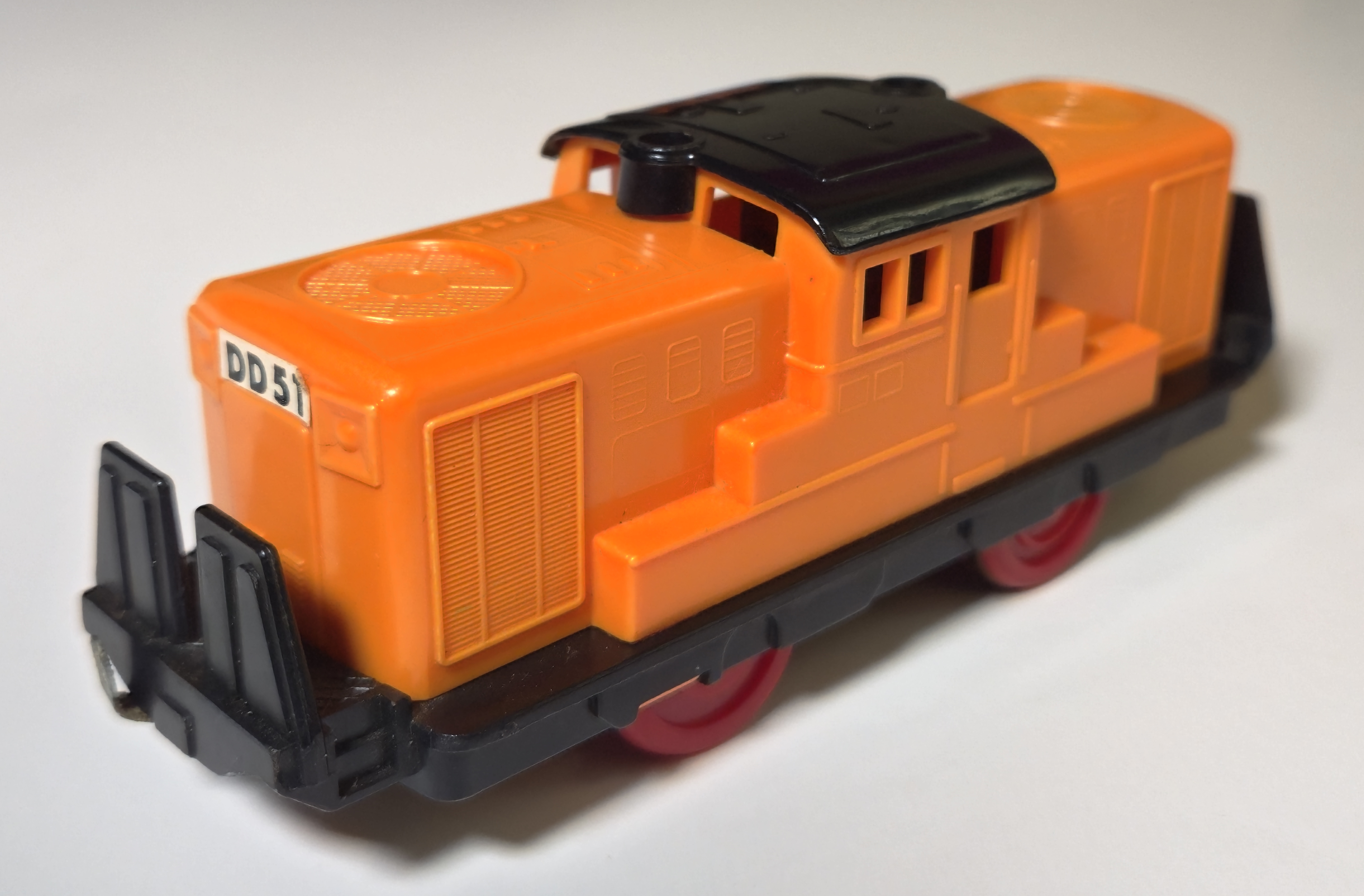 Nearly 650 DD51s were built between 1962 and 1978. They were designed to be more powerful than D51 and faster than C62 steam locomotives still in use in the 1960s and mid 1970s. It seems the DD51 was originally met with similar feelings as diesel locomotives that displaced steam in Britain and nicknames included the "red pig" and "paperweight." As of 2021, ten DD51s were still in regular use, two by JR East and eight by JR West. The D51 is a classic Plarail tooling and was produced almost unchanged between the early 1970s and the mid 1990s when it was updated to new power, most commonly in orange with black chassis that did not closely match its usual more reddish appearance.