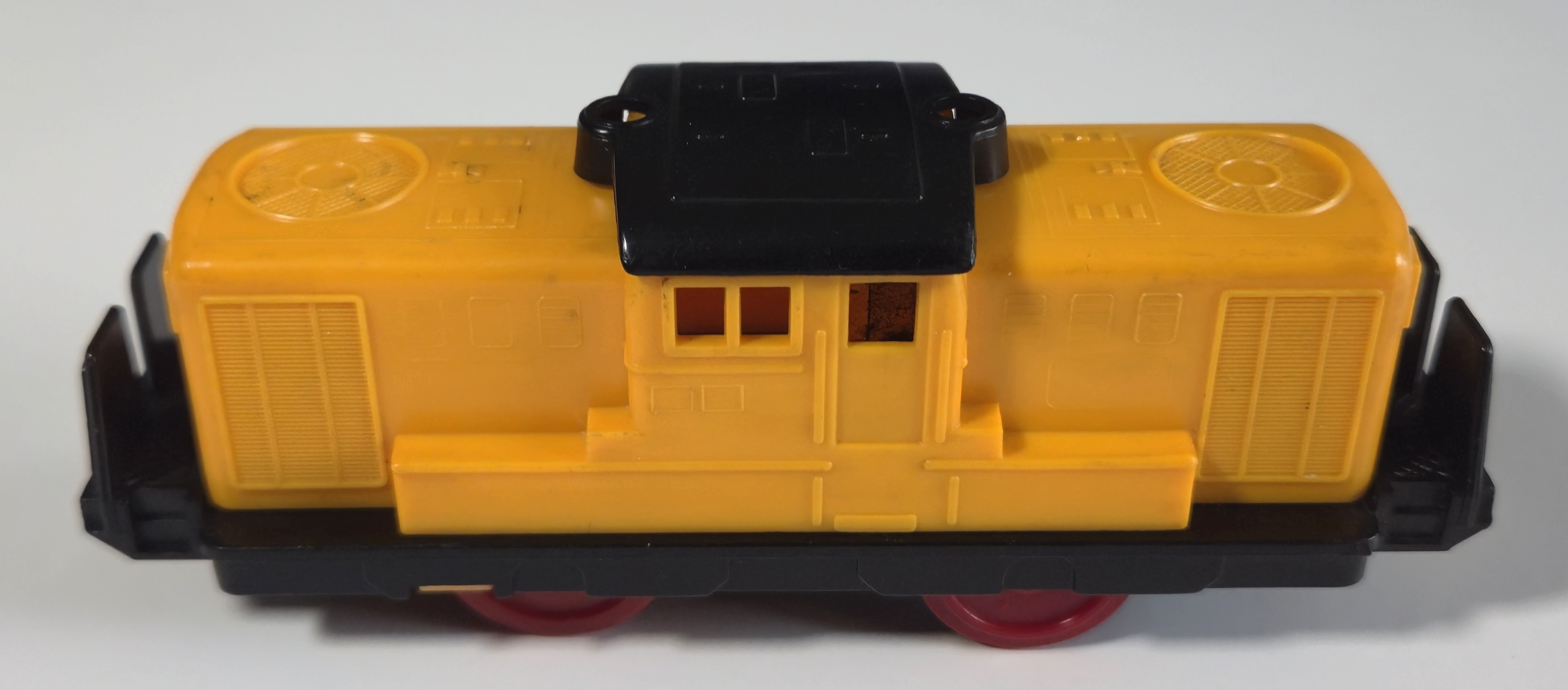In 1994 the DD51 was finally updated with a new axle-drive gearbox. The wheels transitioned from red to yellow and the power switch sticks out of a portion of the cab roof. The chassis continued to include the old "boy and girl" Tomy logo and the remnants from where the all-metal gearbox originally clipped into place can still be seen.