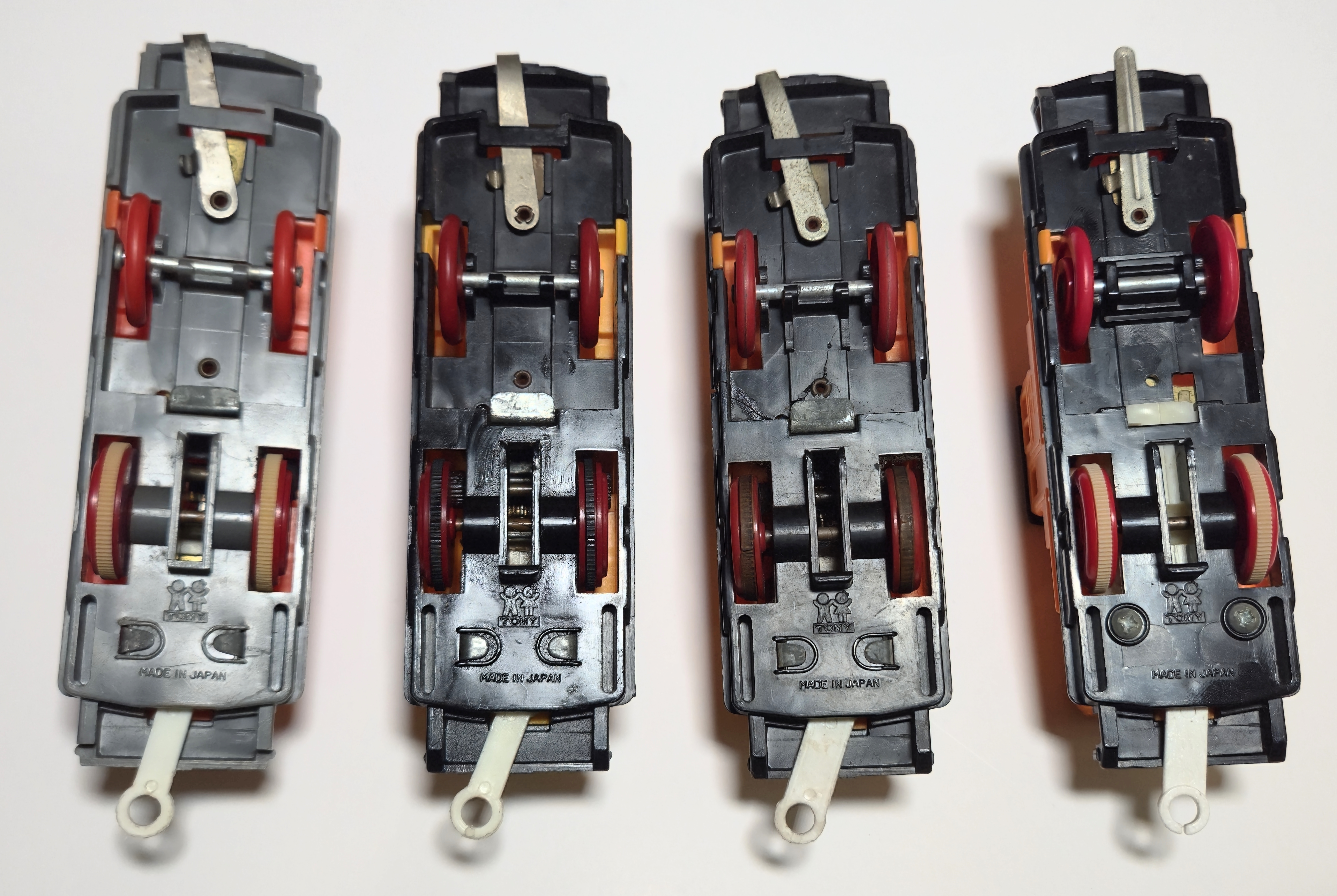 Internally the battery contact strips are different to mate with the plastic rim drive gearbox and the chassis has been changed to accommodate it. The chassis is still marked with the Tomy logo and made in Japan text. The roof of the body shell was also thinned out above the gearbox to fit the new taller plastic style (note the lack of a rear round molding mark like the older style, which was still retained in the front of the shell), meaning that an older body shell will not fit over the plastic gearbox. Like other Plarail trains, later power switches were not bent upwards for whatever reason (one fewer step on the production line?)