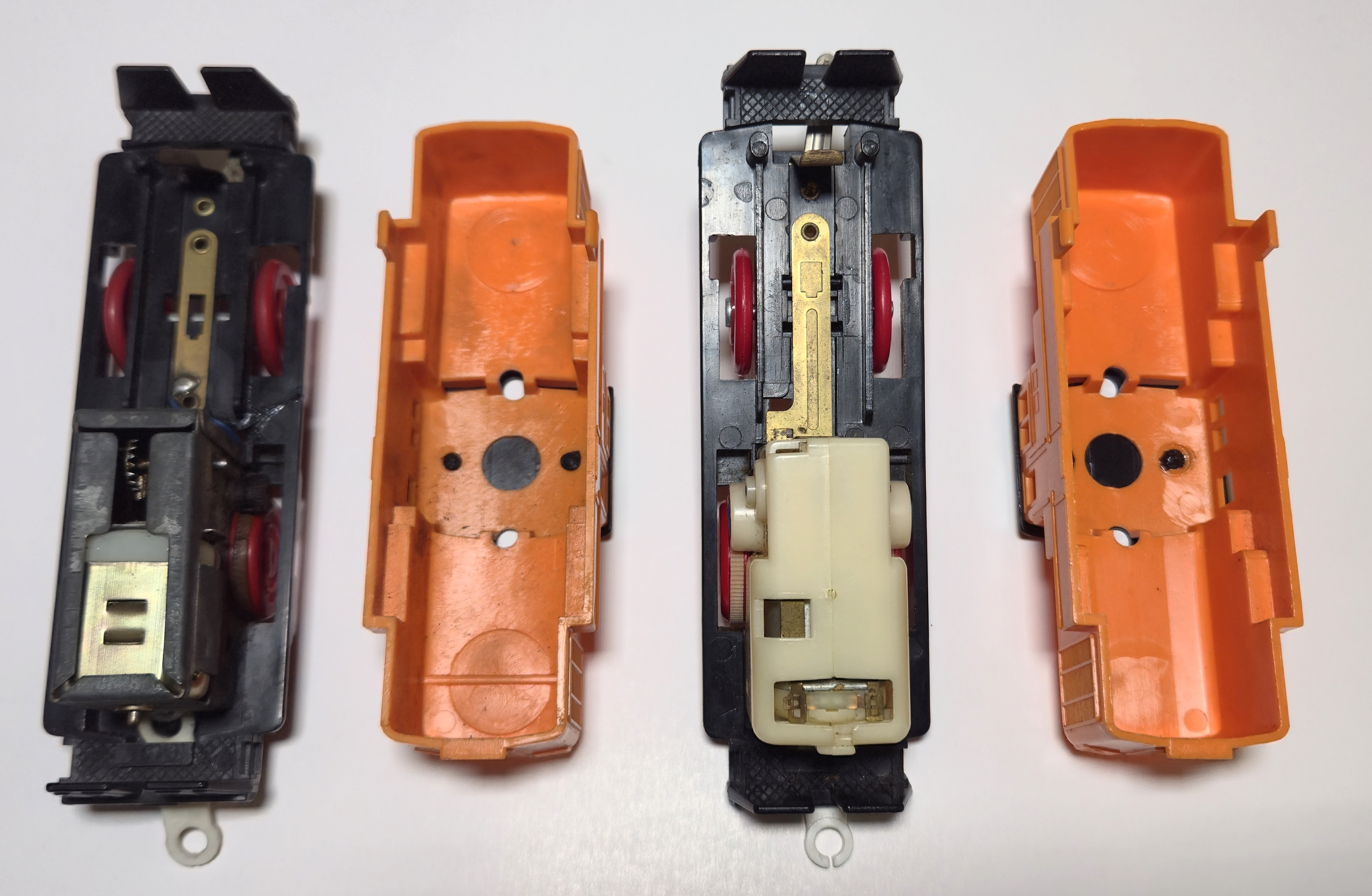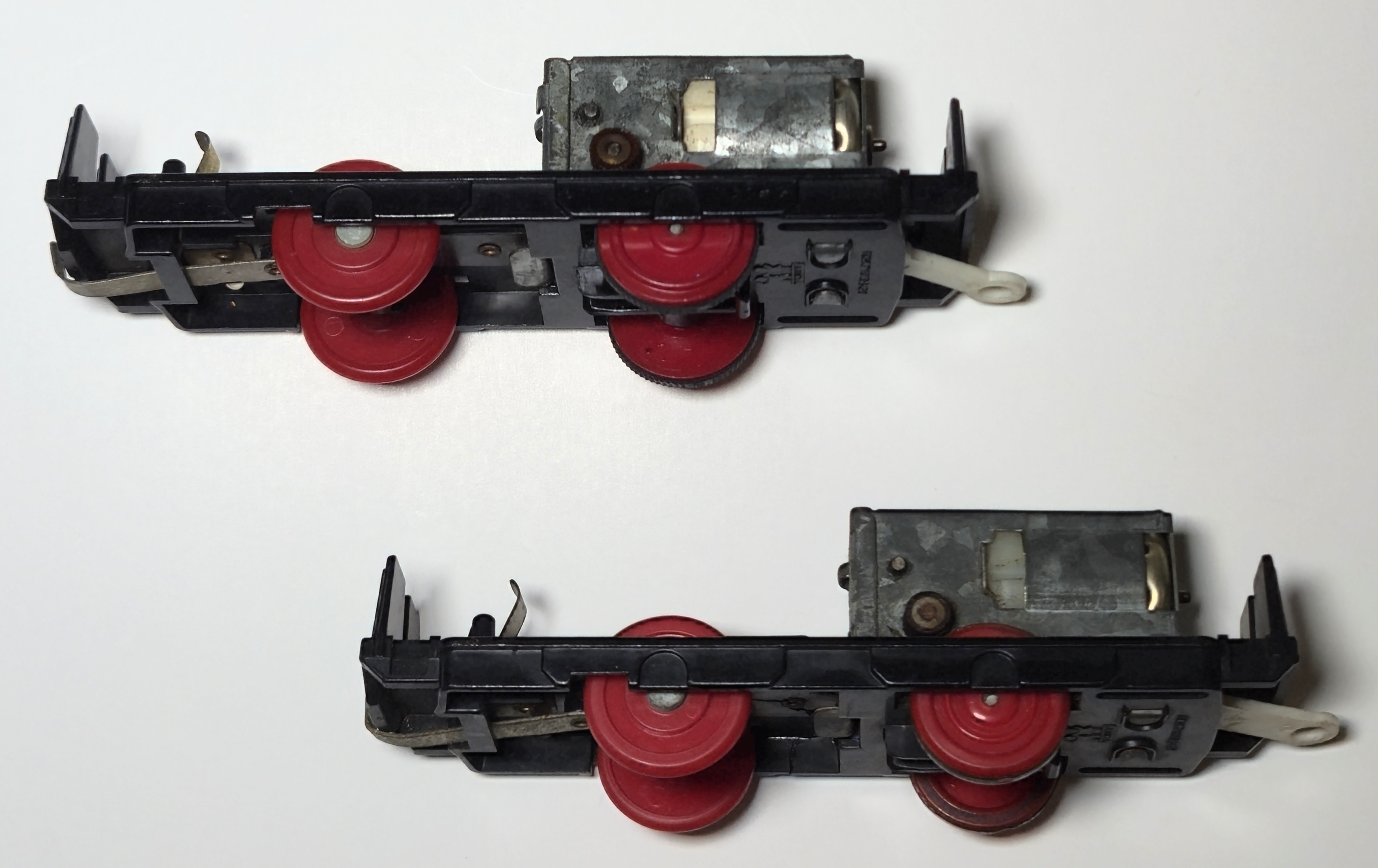 The gearbox puts the plastic chassis under tension, so these older chassis are sometimes cracked and split. I glued this one back together after photographing it. On the right is the previous variation of DD-51 chassis with older design of rear wheels.