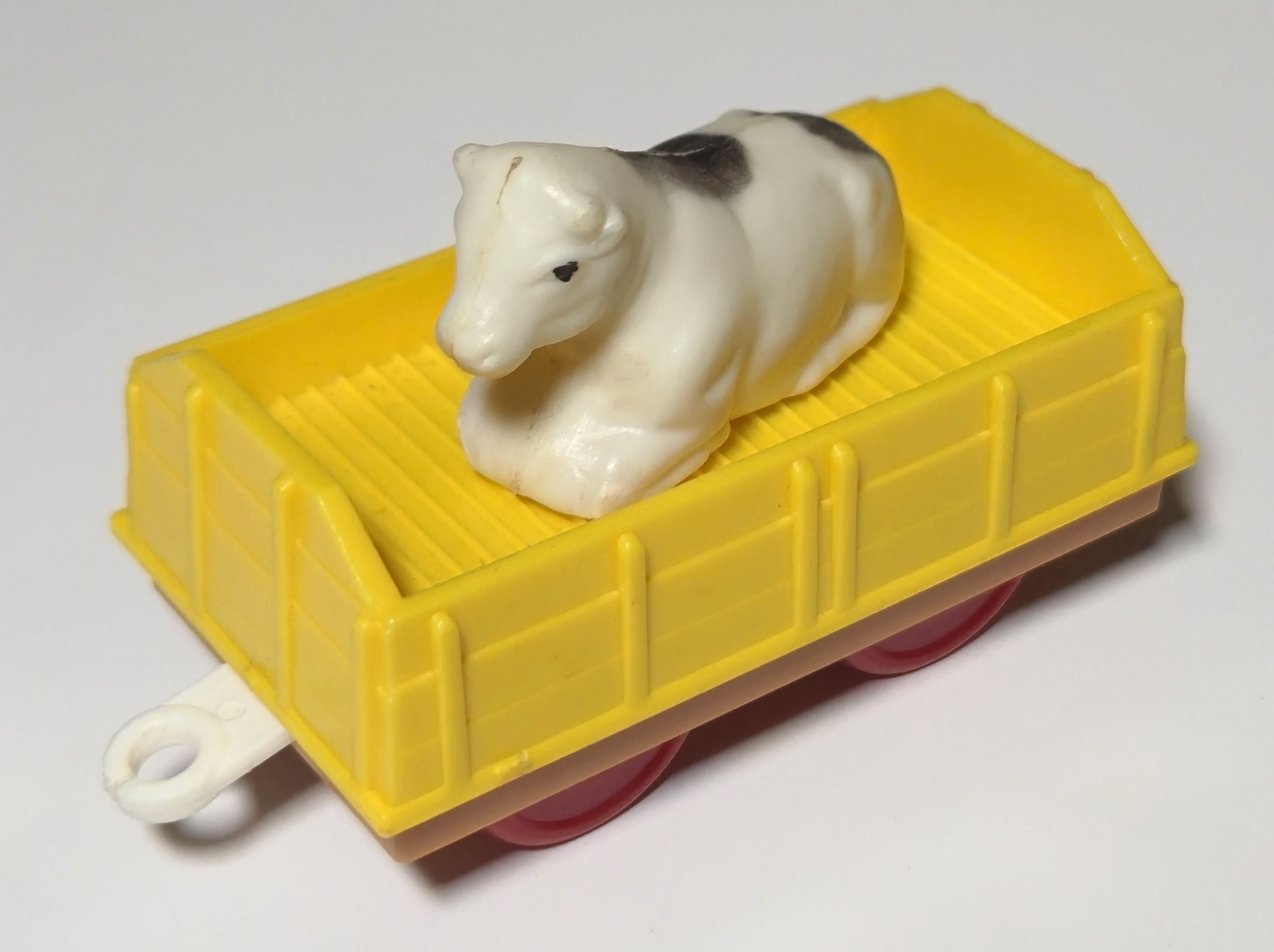 In 1976 the D-51 Ranch Set included two yellow log cars with orangey-brown chassis. The cows included in the set (as well as the individual Farmhouse accessory) fit inside the open wagons.
