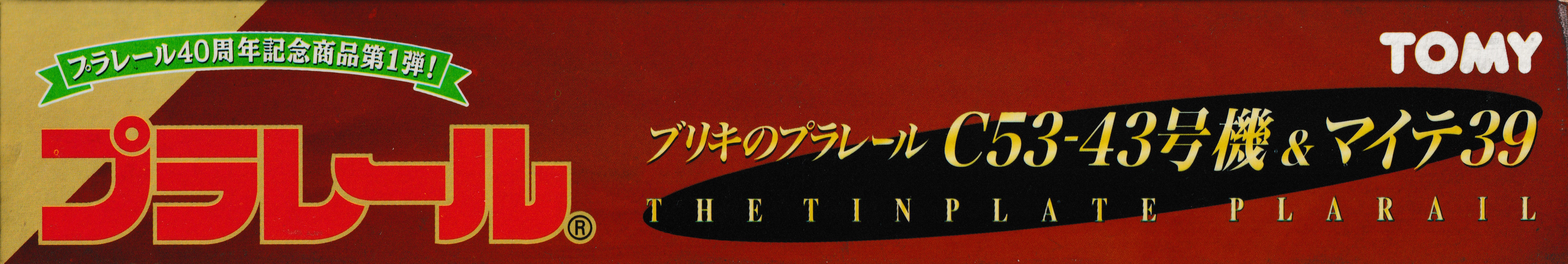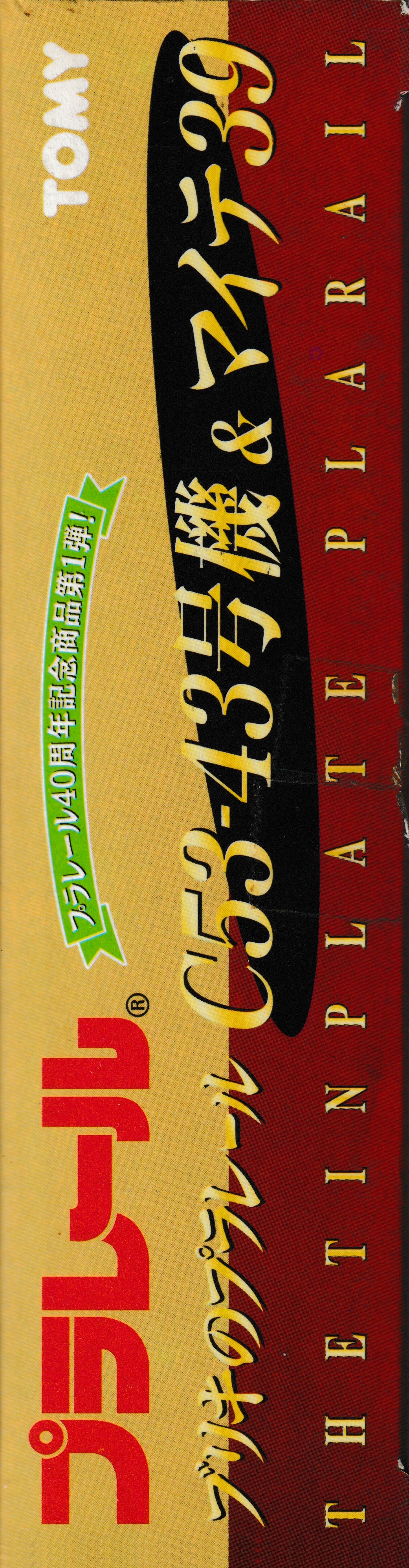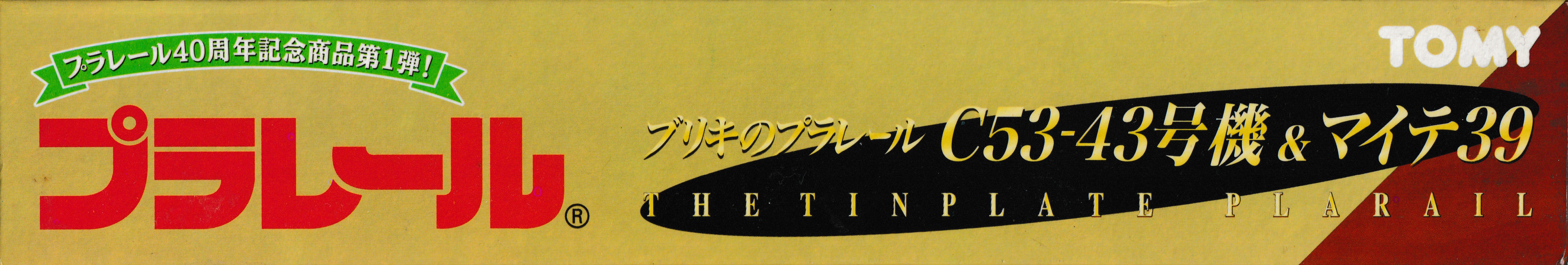 In 1999 as part of their celebration of the 40th anniversary of Plarail Tomy released a tinplate C53 steam locomotive and passenger car as ブリキのプラレールC53-43号機&マイテ39 or Tin C53 unit 43 & Maite 39. The back of the box says of the C53, approximately: The C53 type was designed for towing limited express trains, and a total of 97 locomotives were manufactured by 1931 (Showa 6). Among them, C53-43 was modified as the first streamlined locomotive. Its body is covered with a streamlined cover from the boiler to the dome, the driver's cab, and even the tender car is unique among the C53 types. Of the observation car it says: The Maite 39 type was a prewar Japanese-style observation car with an old-fashioned double-layer roof, and its predecessors were the Suite 37000 type and the Suite 37010 type. When the limited express train was revived after the war, it was equipped with an air conditioning system, and some parts were modified to a western style. it was mainly used on the limited express Tsubame. The glittering observation room with an observation deck had a capacity of 10 people. The set first went on sale in February 1999 at a suggested price of 3,000 yen - 800-1000 yen more than the most expensive regular three-pack Plarail releases.