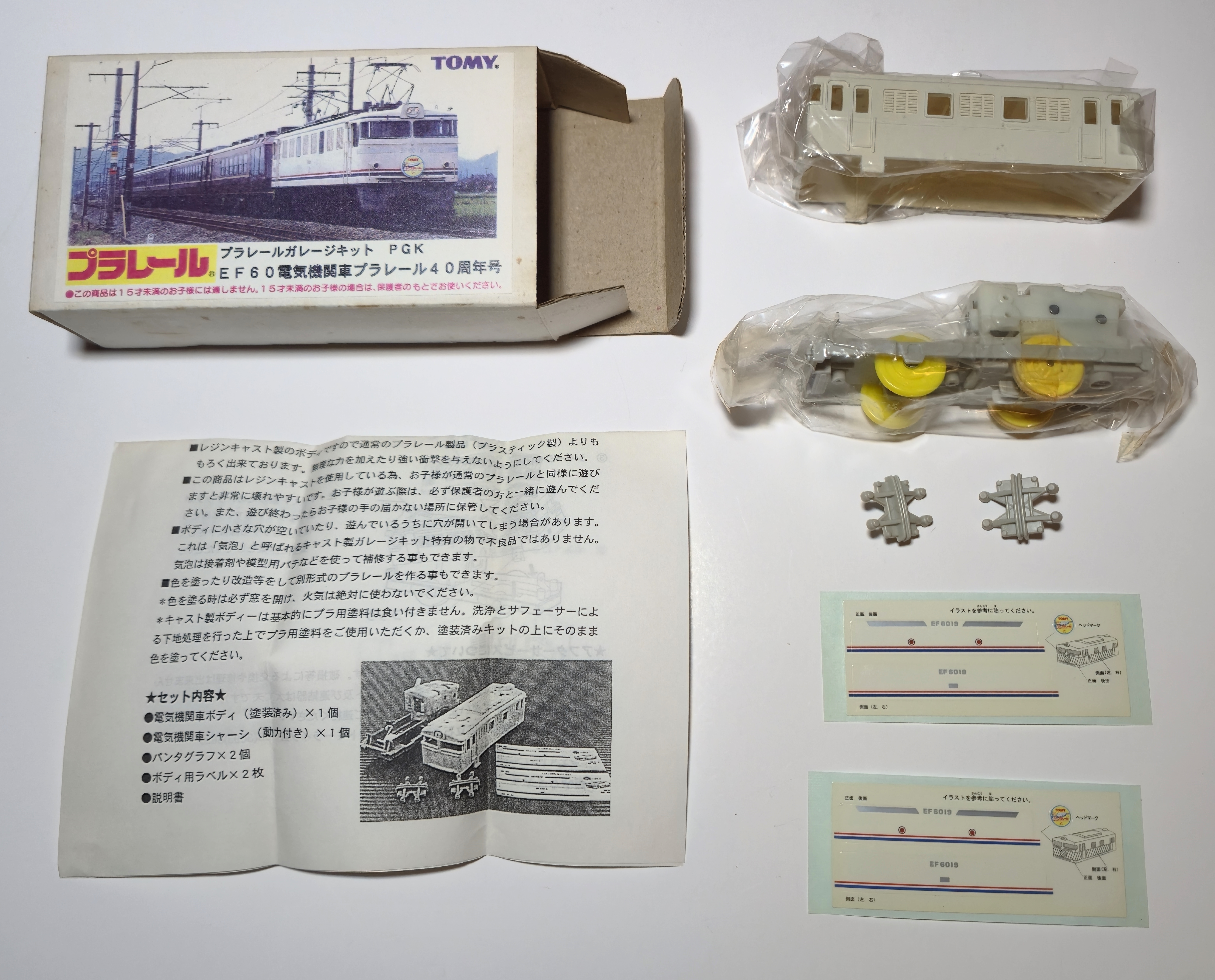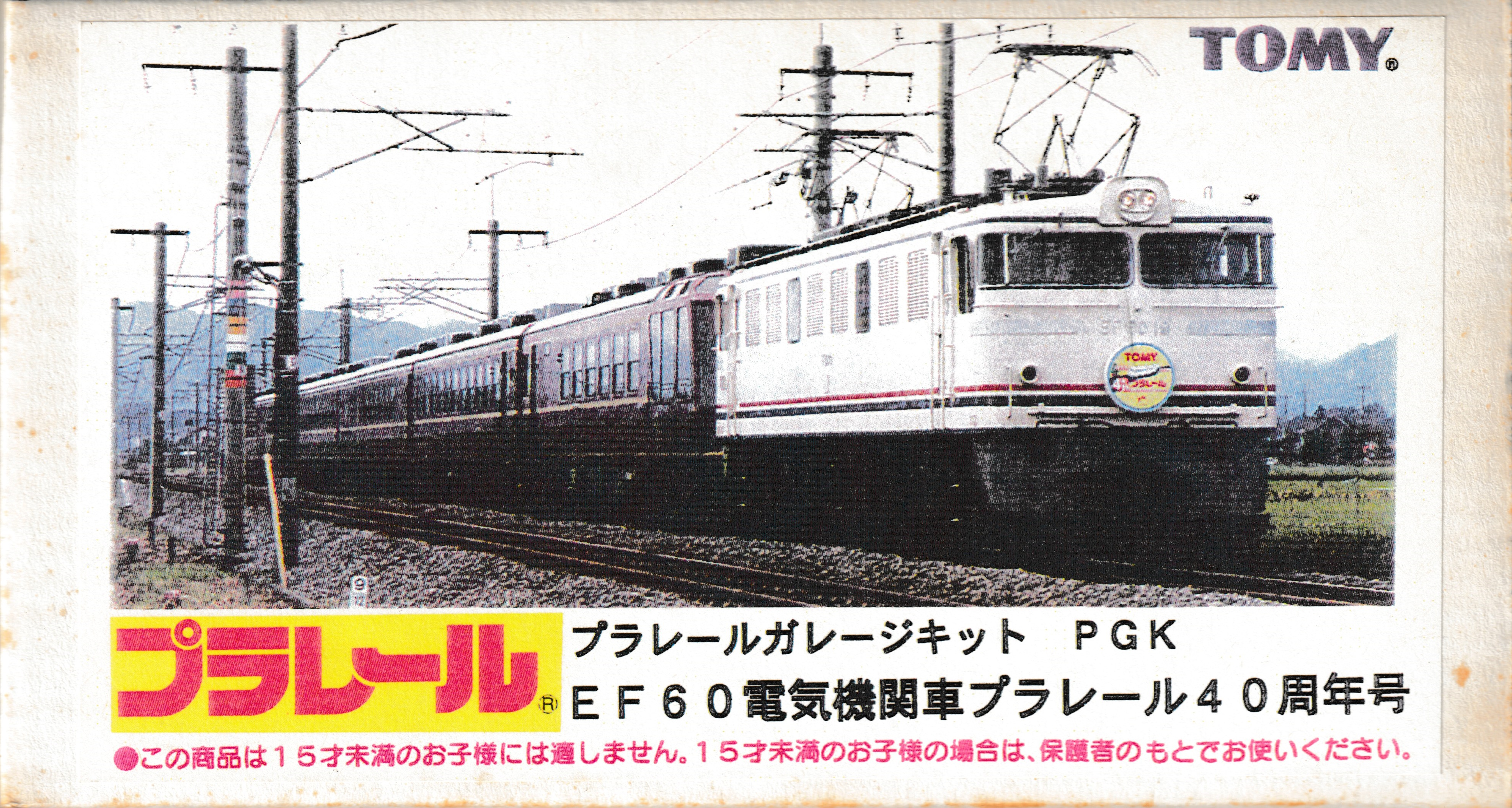 Actually, the real 40th anniversary Plarail train was hauled by a white EF60, and a "garage kit" of the locomotive was released at the Tokyo Character Show 2000 held in July 2000 as the EF60 Electric Locomotive Plarail 40th Anniversary Edition. This kit had a resin body that shrinks over time, and comes unassembled with a sticker sheet to apply. Details about assembling one of these EF60 locomotives can be seen in the Plarail Museum Special Exhibition section.