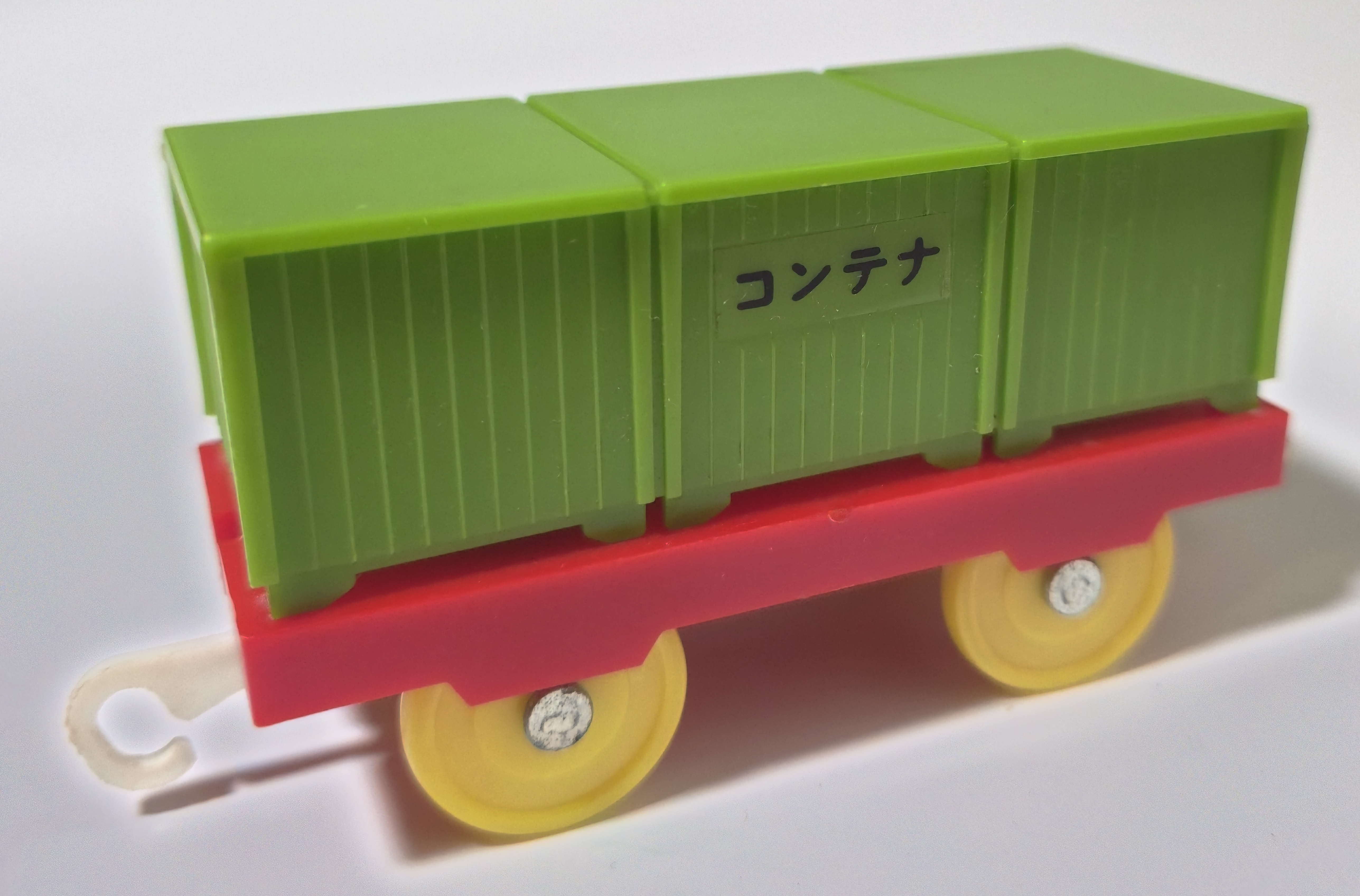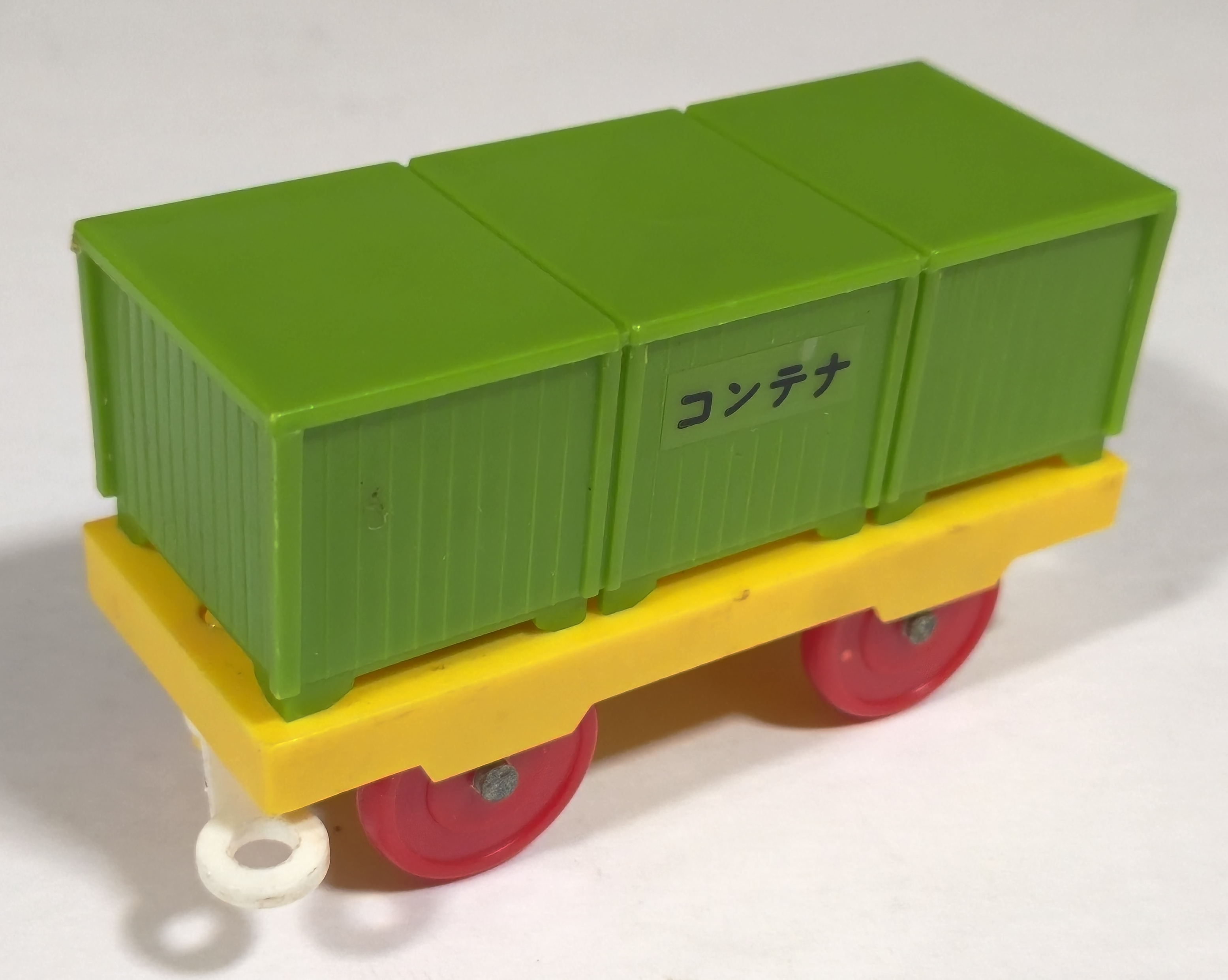 The two flatbeds are an identical brownish red and come with two pairs of basic but nice looking containers. These flatbeds originate in the late 1998 Play Wagons Set. These containers do not have the magnets installed underneath. The flatbed molding is the Thailand update of the original curvy Tomy logo original molding.