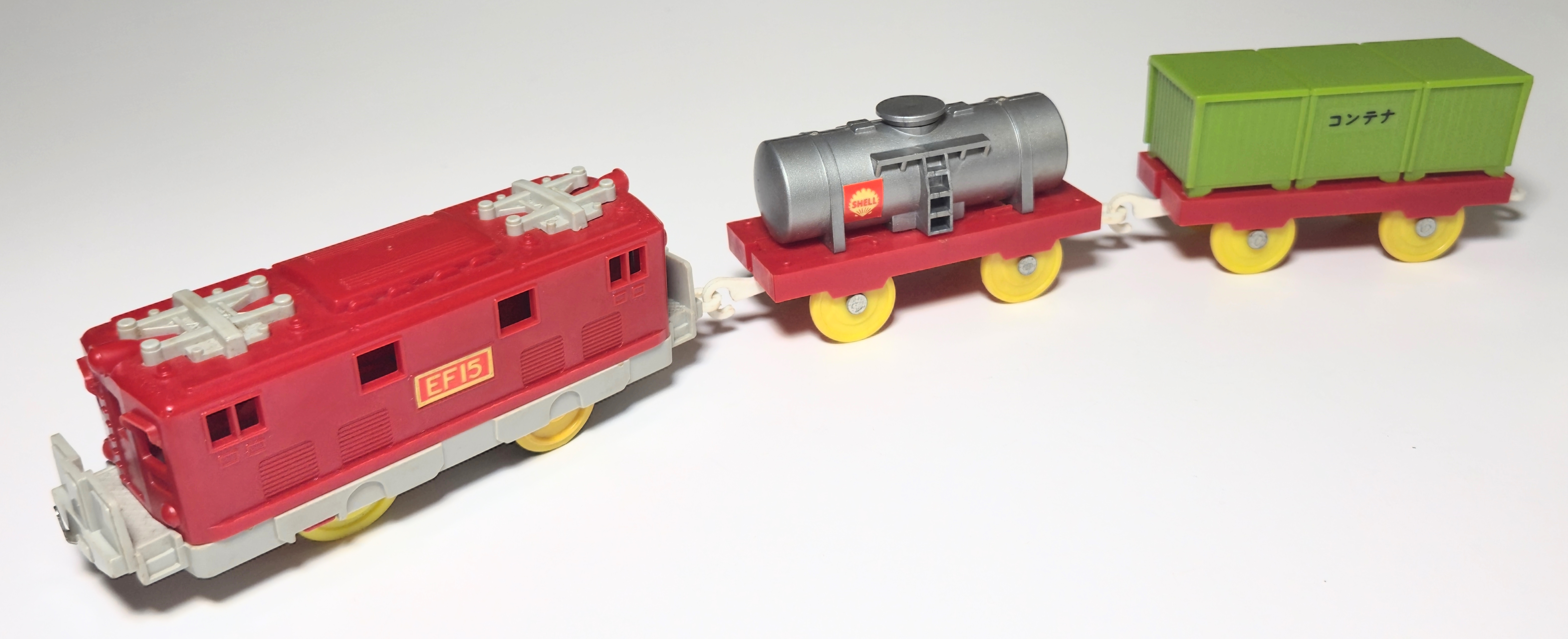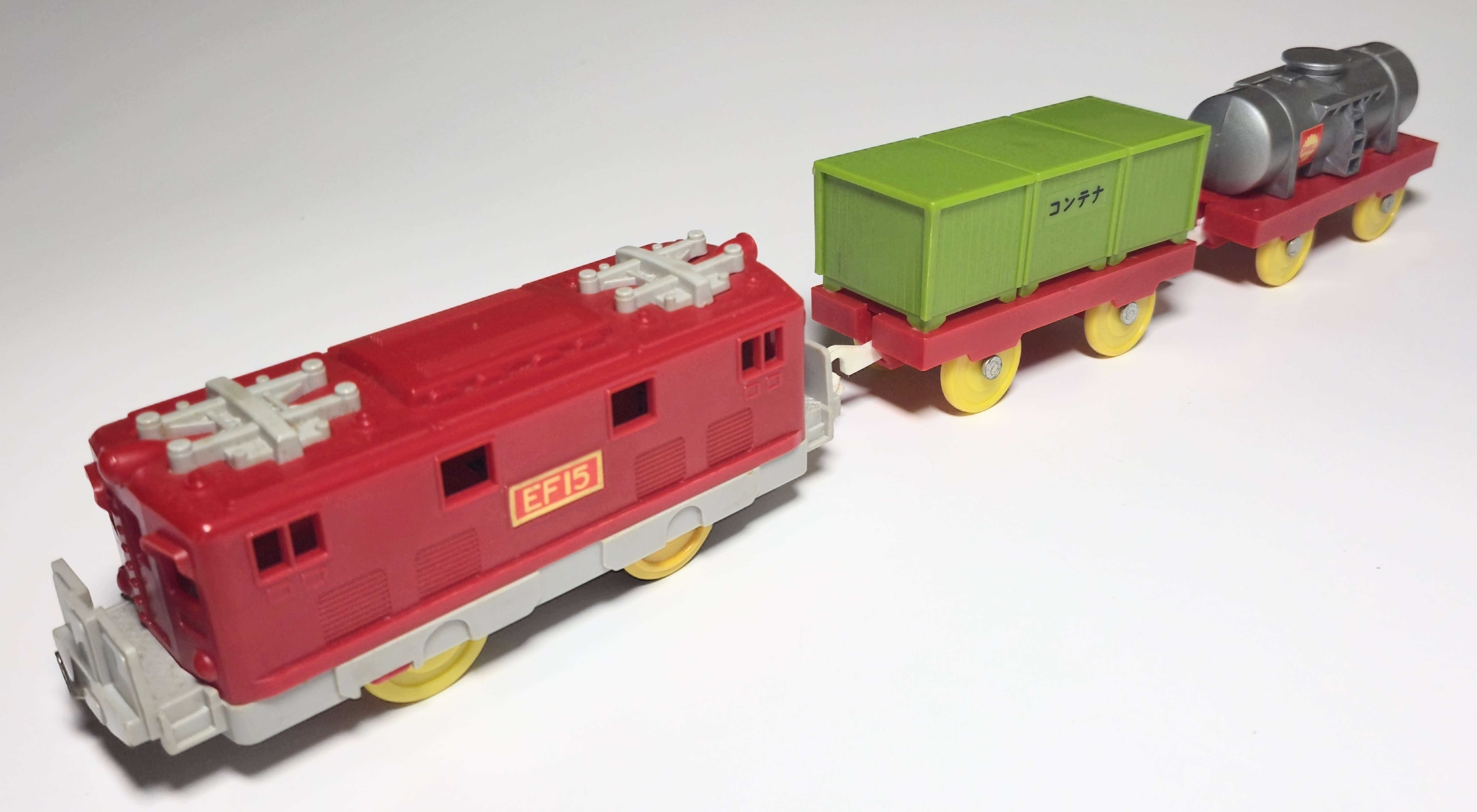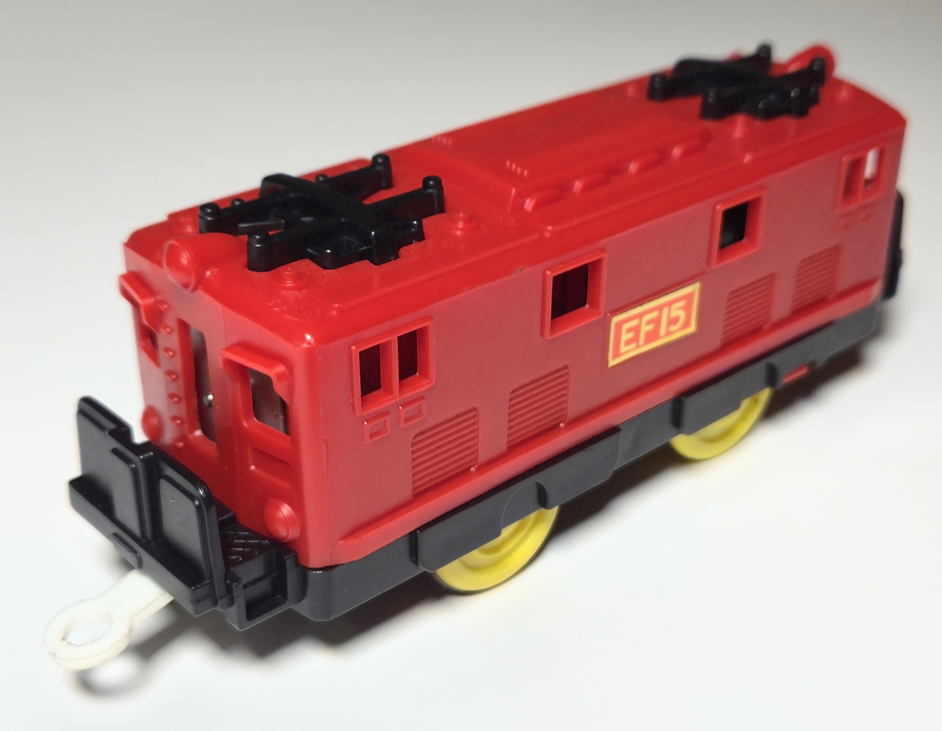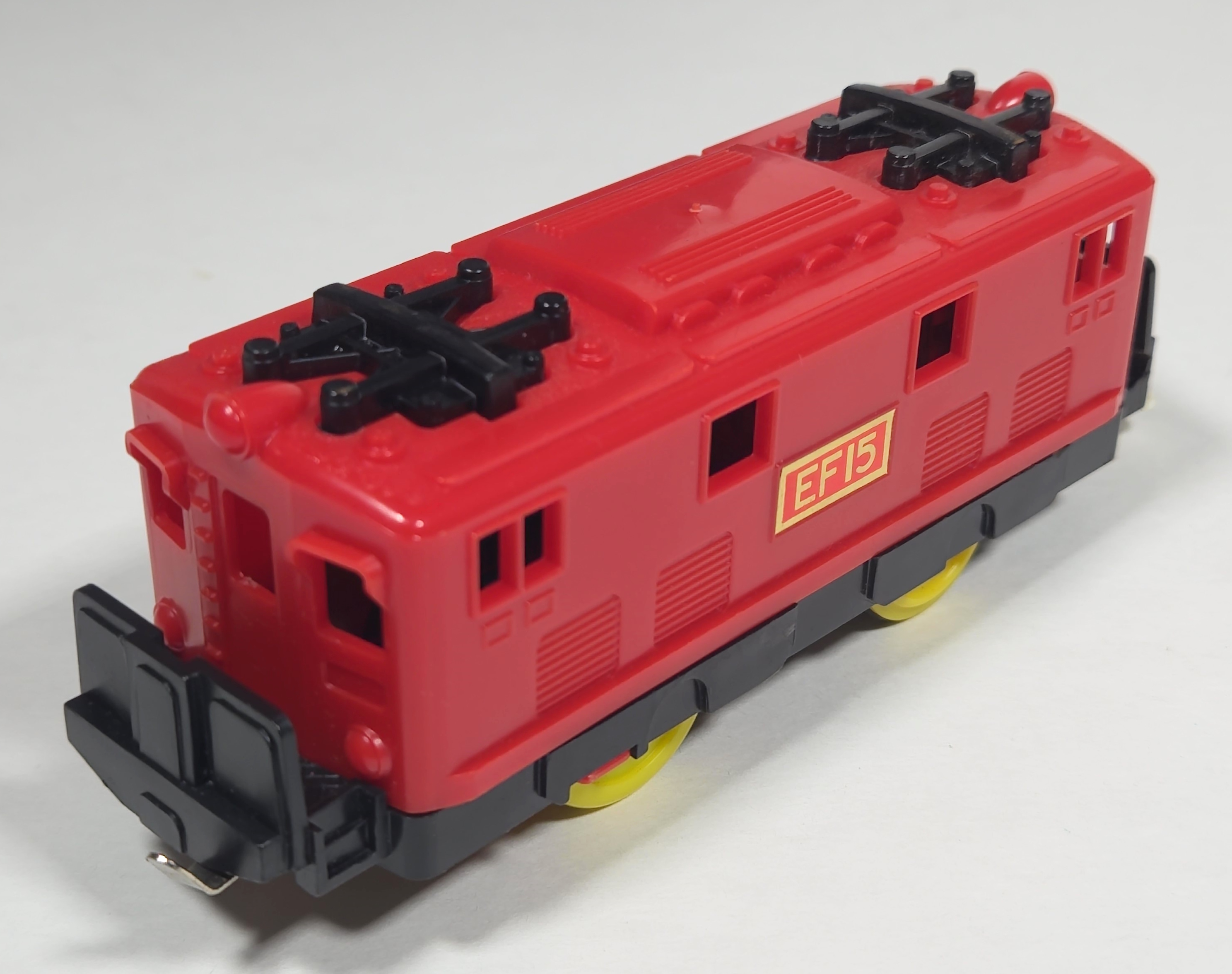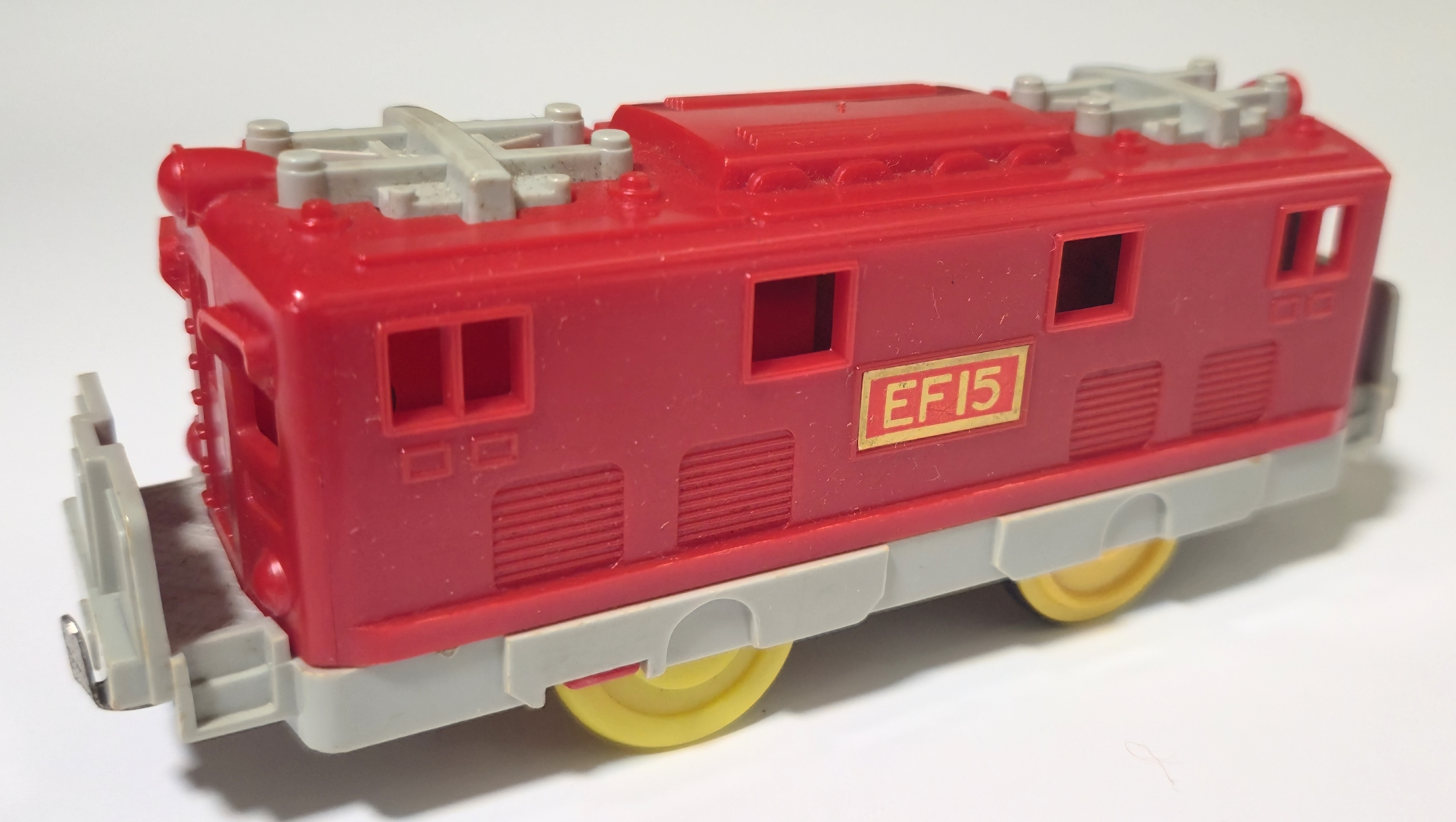 The EF15 was manufactured between 1947 and 1958. Over 200 were built and they remained in use until the mid 1980s on freight lines. The Plarail EF-15 was introduced in 1970 and was a regular release for the rest of the 1970s and also appeared in a long-lasting set in the 1980s. It disappeared from the range with the move to new power before reappearing with a modern gearbox in 2001.