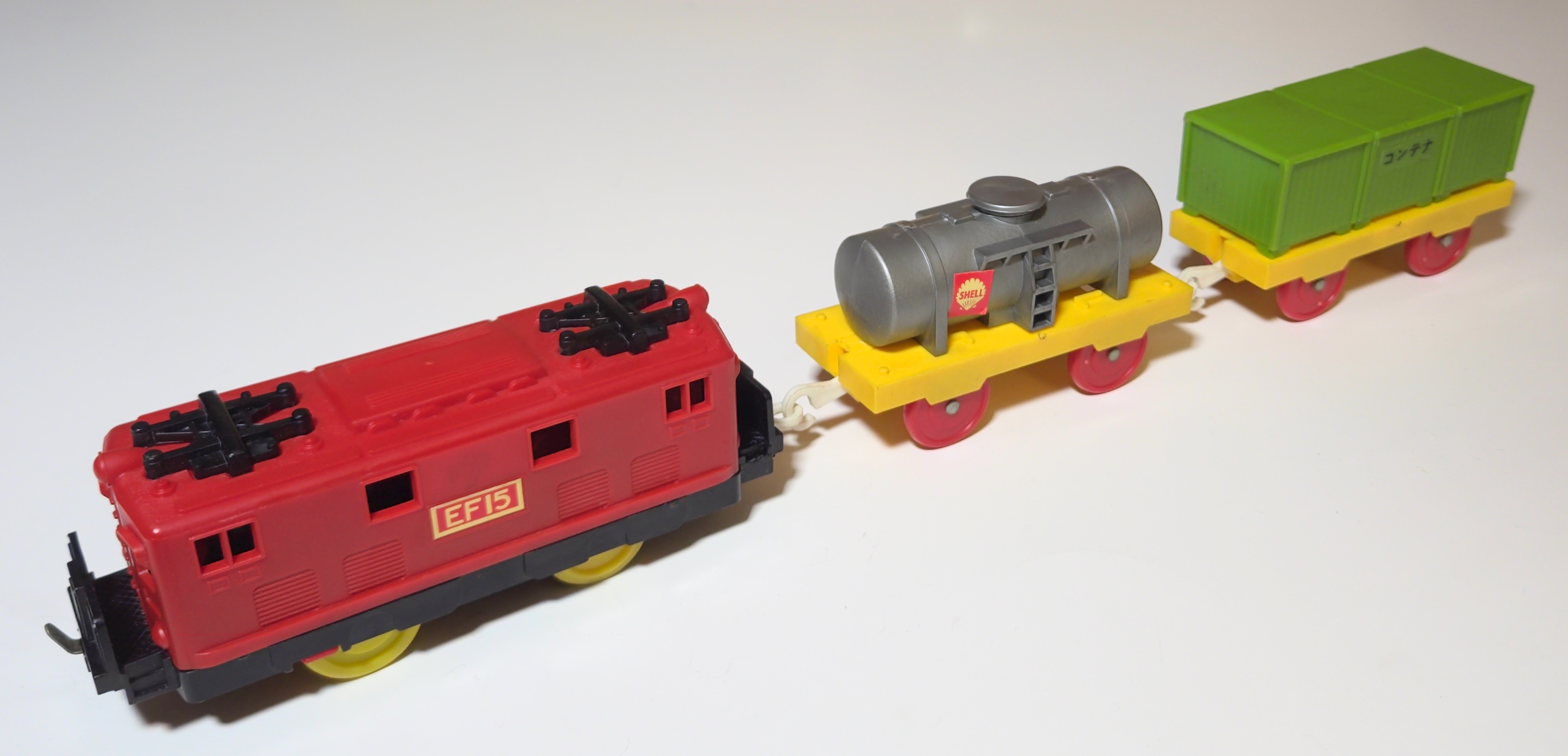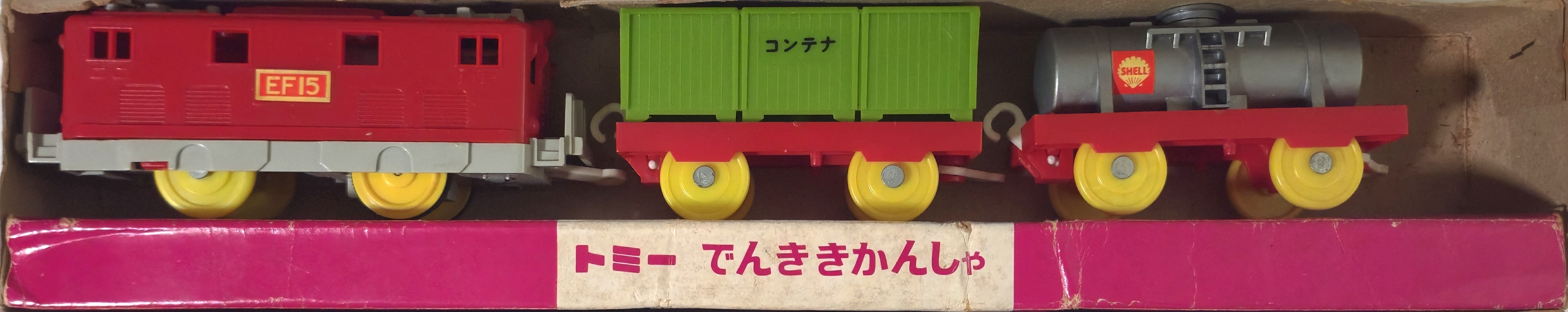 The EF-15 debuted in 1970 in the second generation of lift-top box as well as the Electric Locomotive Set. Being the only electric locomotive in the range at the time, it was simply called the Electric Locomotive (でんききかんしゃ).