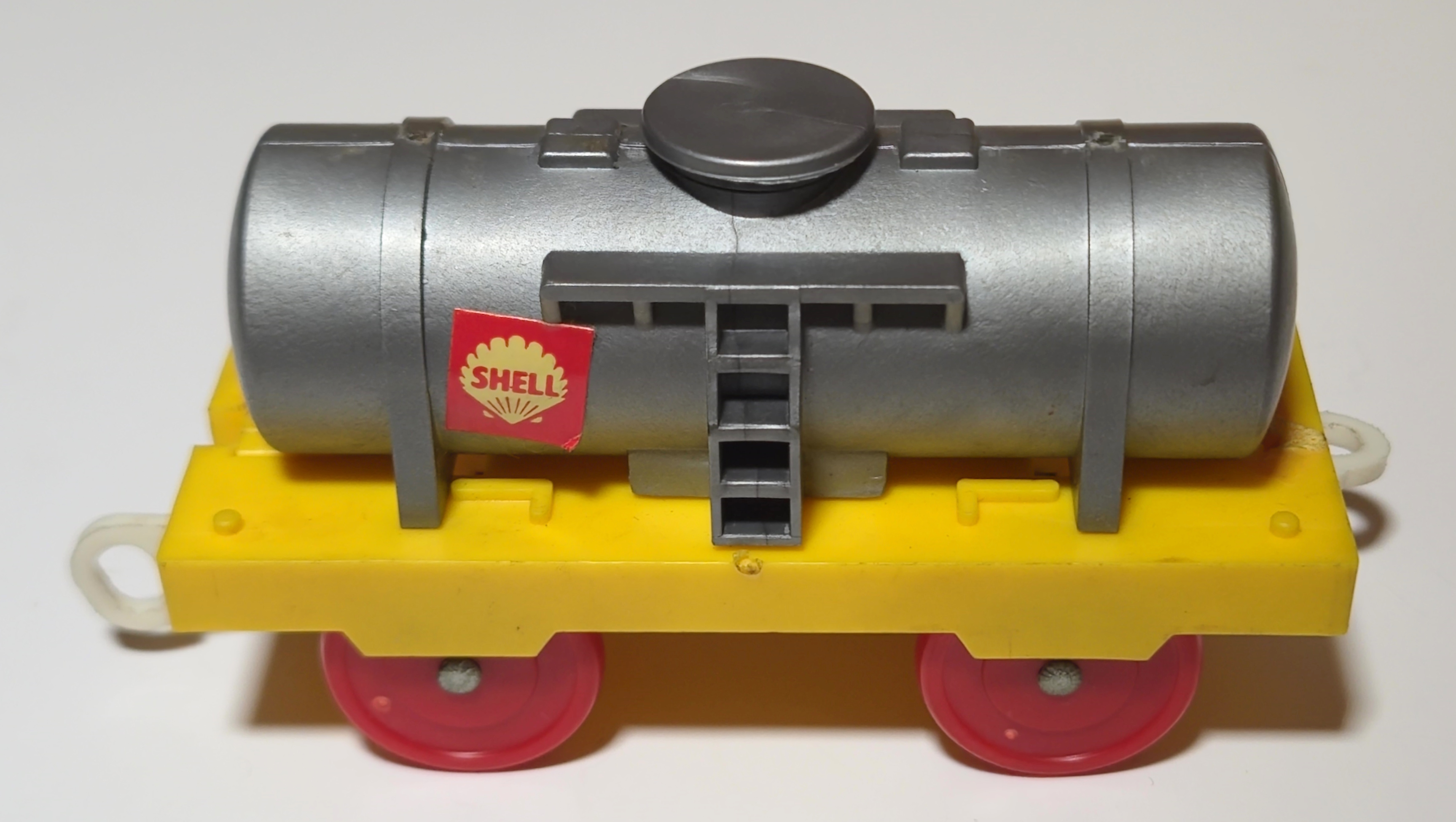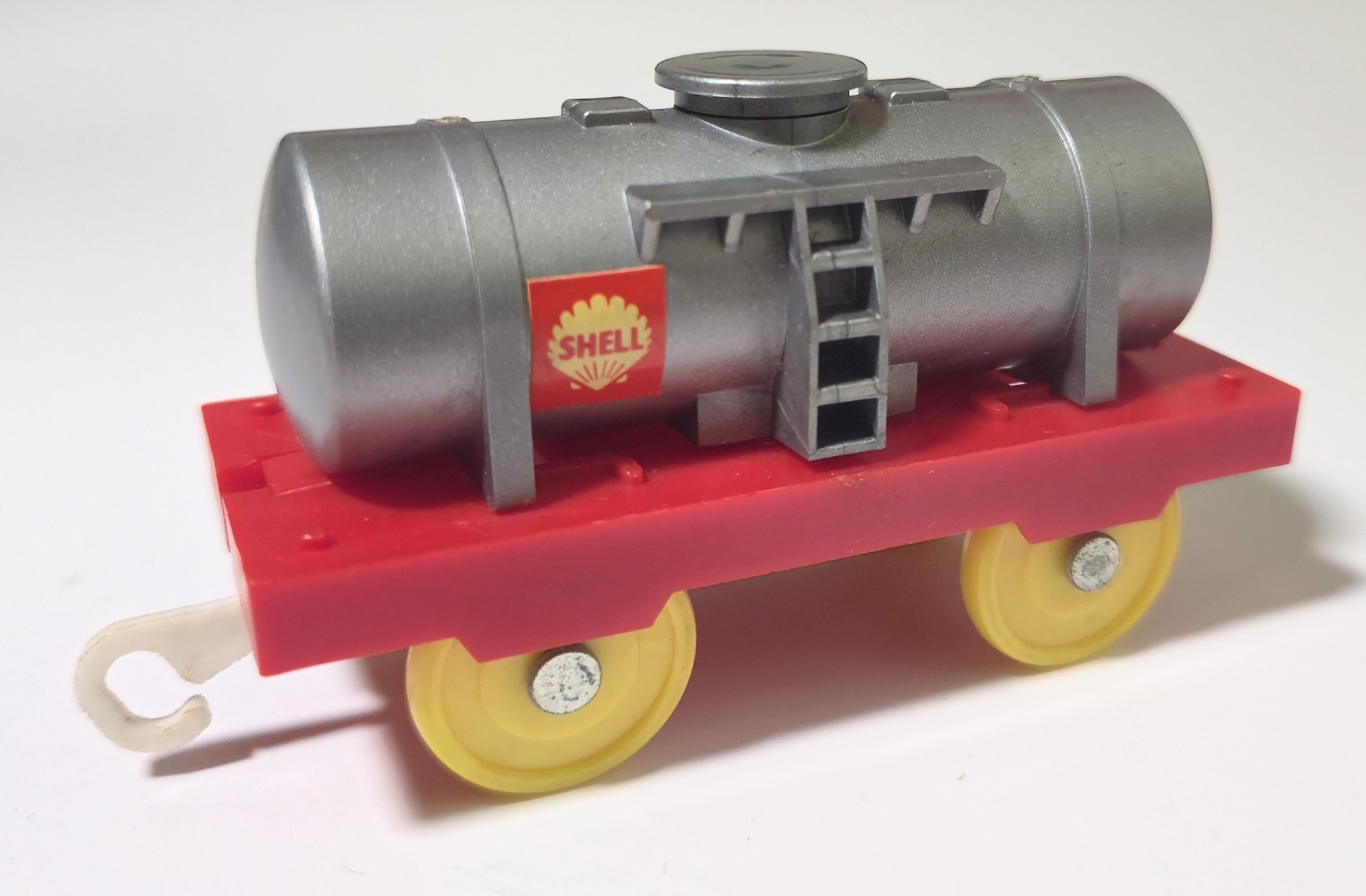 The freight cars changed to the more familiar and longer-lasting style, although they are the earliest type that still used the older chassis tooling without additional axlebox details that better cover the wheel's axles as well as plastic rear coupler plugs and the more silvery tanker with square Shell logo sticker.