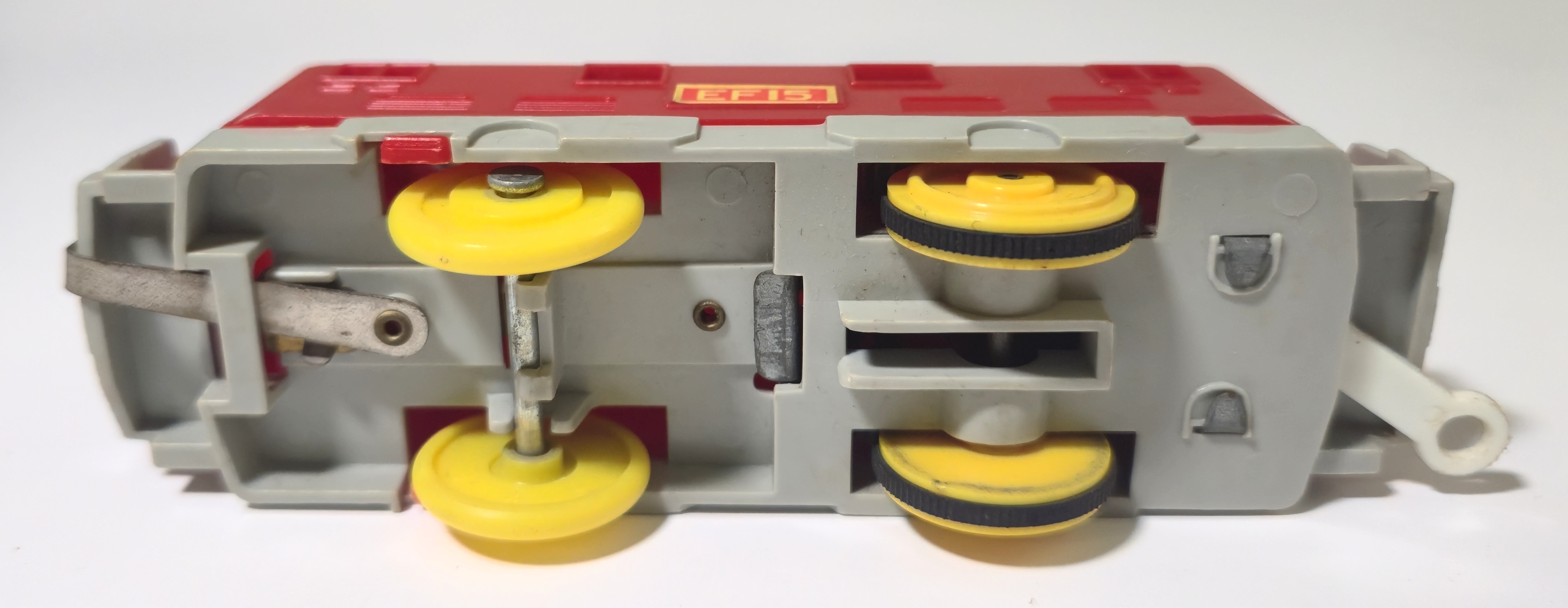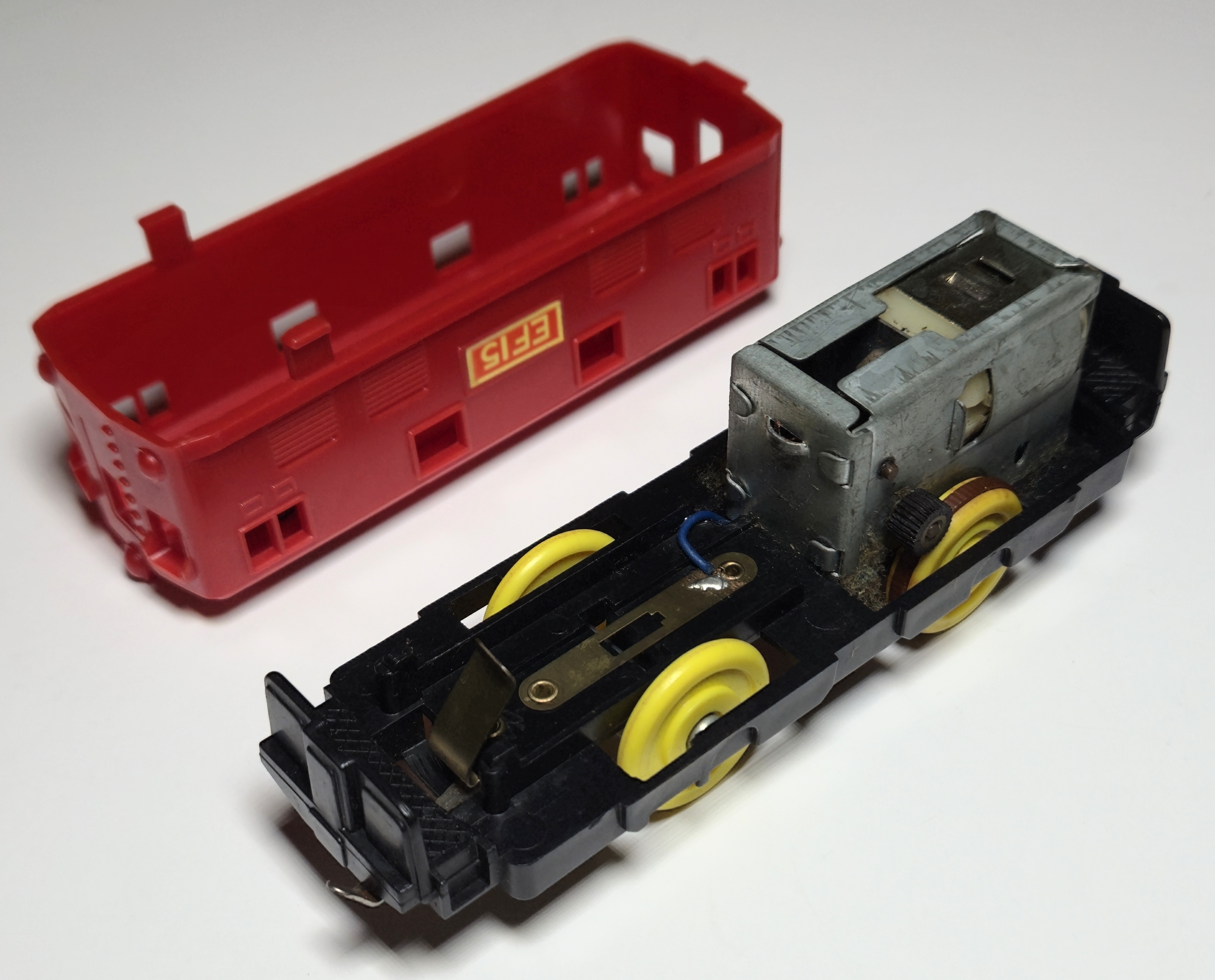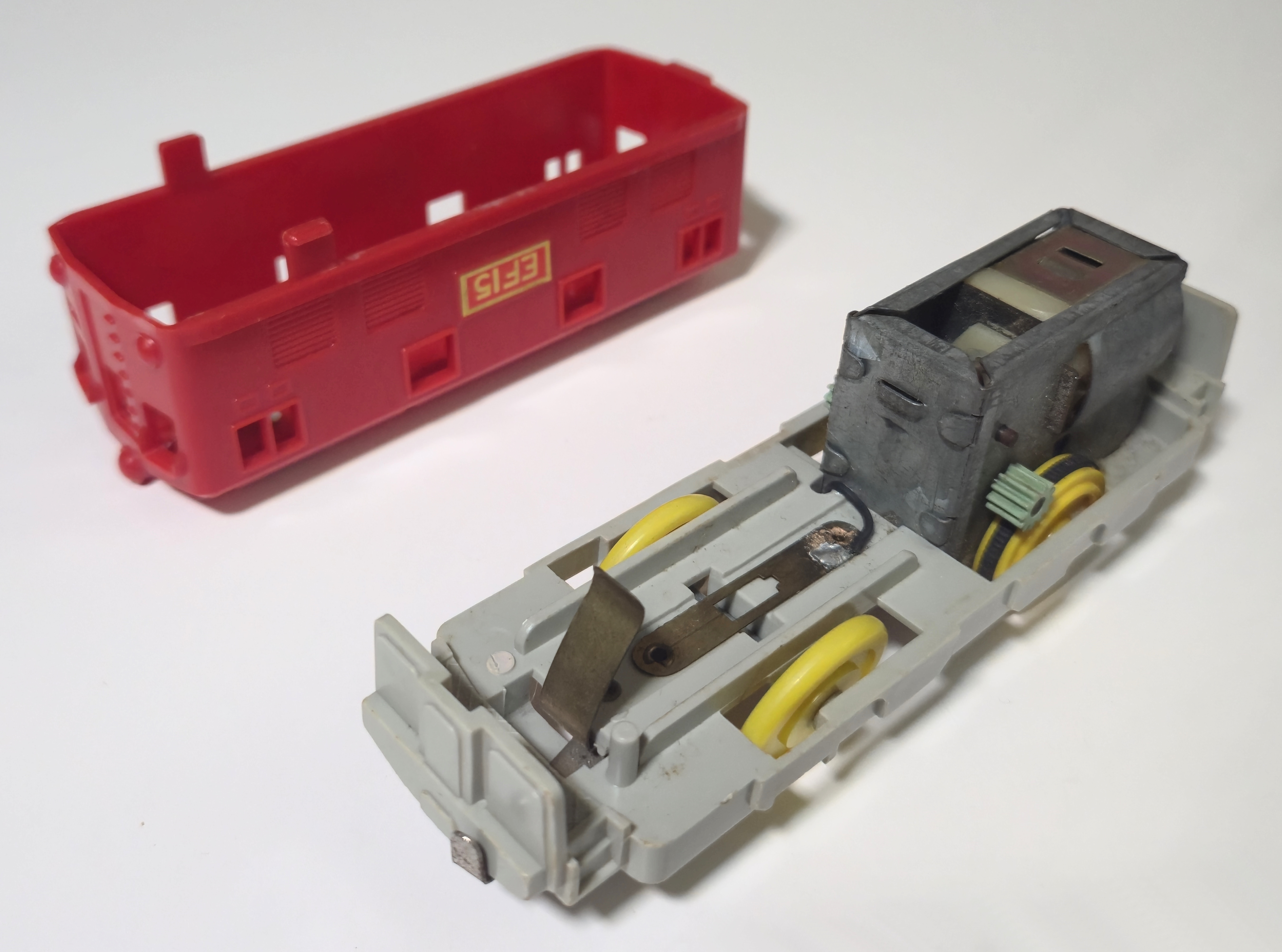 Early examples used up the leftover grey chassis components from the lit version but most of these EF-15s were black. The body shell has the holes in the headlight and for the rivets that held the contact strips in, and the chassis also carries forward the modifications for the additional electrical strips. Unlike the DD-51 with a similar chassis that was eventually updated to use the plastic old-power gearbox, the EF-15 continued to use a metal one.