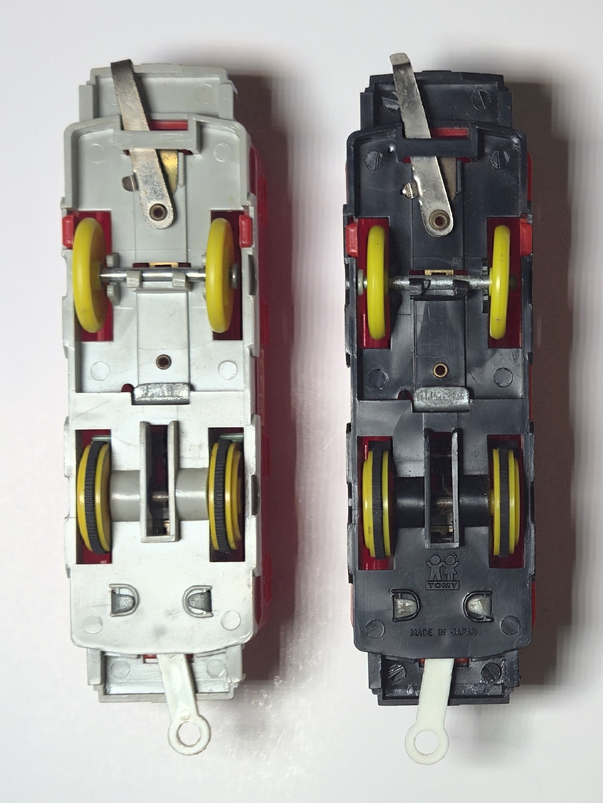 Another change to the tooling was the addition of the Tomy logo and made in Japan marks on the bottom of the chassis, which were not present on the original grey chassis. These early examples from 1972-1973 still use the older, thinner style of black tires. Actually, it seems that the molding around the steps on the sides of the chassis became rougher and less consistent during this time, and the stairwell often has a rounded bottom rim or has the bottom few steps walled in.