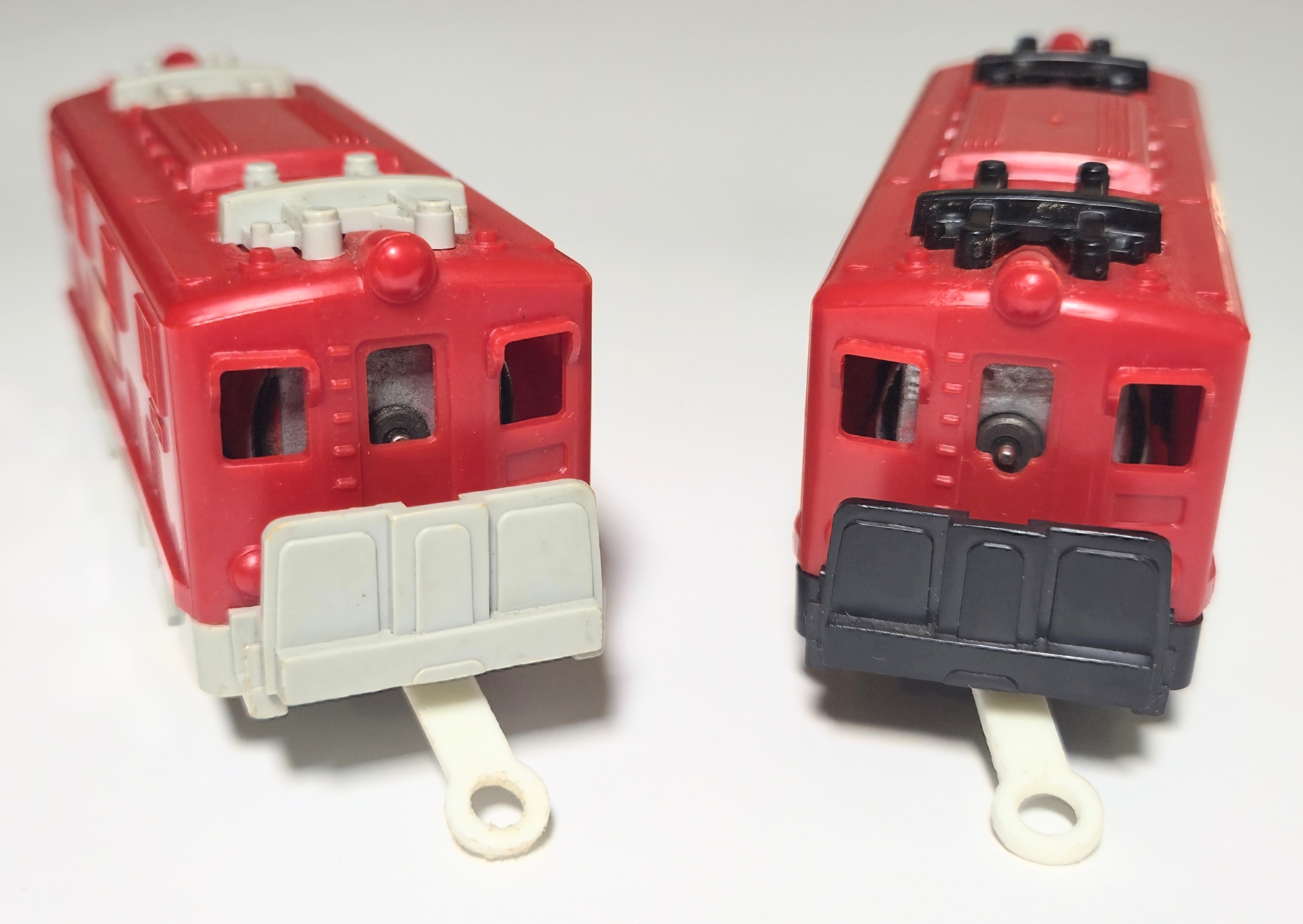 Around 1972 the EF-15 was updated to use black plastic, perhaps to consolidate the different colors that Tomy was producing for different products. A rounded cutout was added to the rear door's window to accommodate the motor shaft better. The color changes seems to have happened slightly after the ST mark appeared on boxes - the Plarail Museum has a grey-chassis train in an individual release box with an early ST mark, with black-chassis trains appearing in copies of the Electric Locomotive Set that have the 1972 sticker celebrating 100 years of railways in Japan on the box.