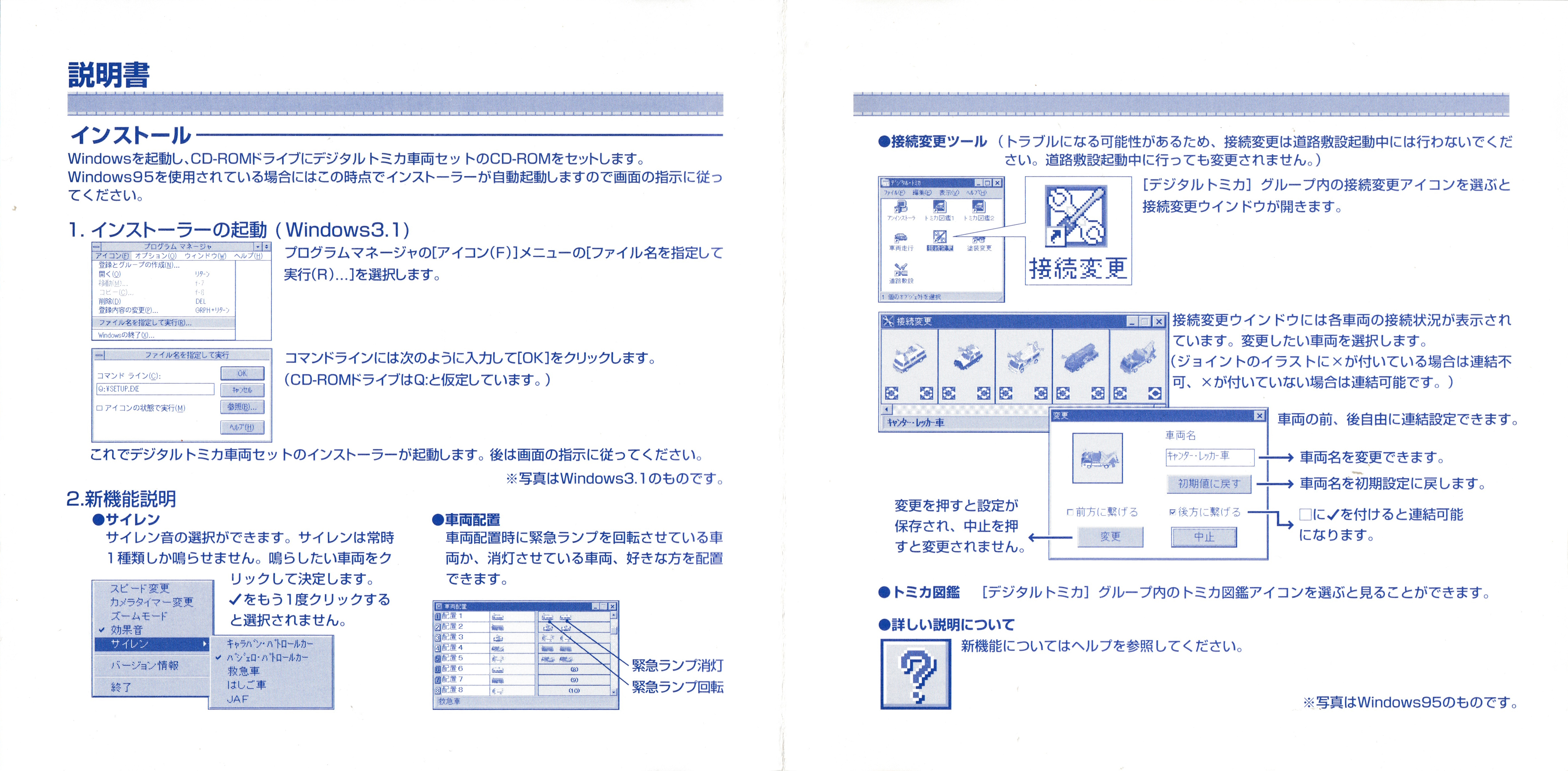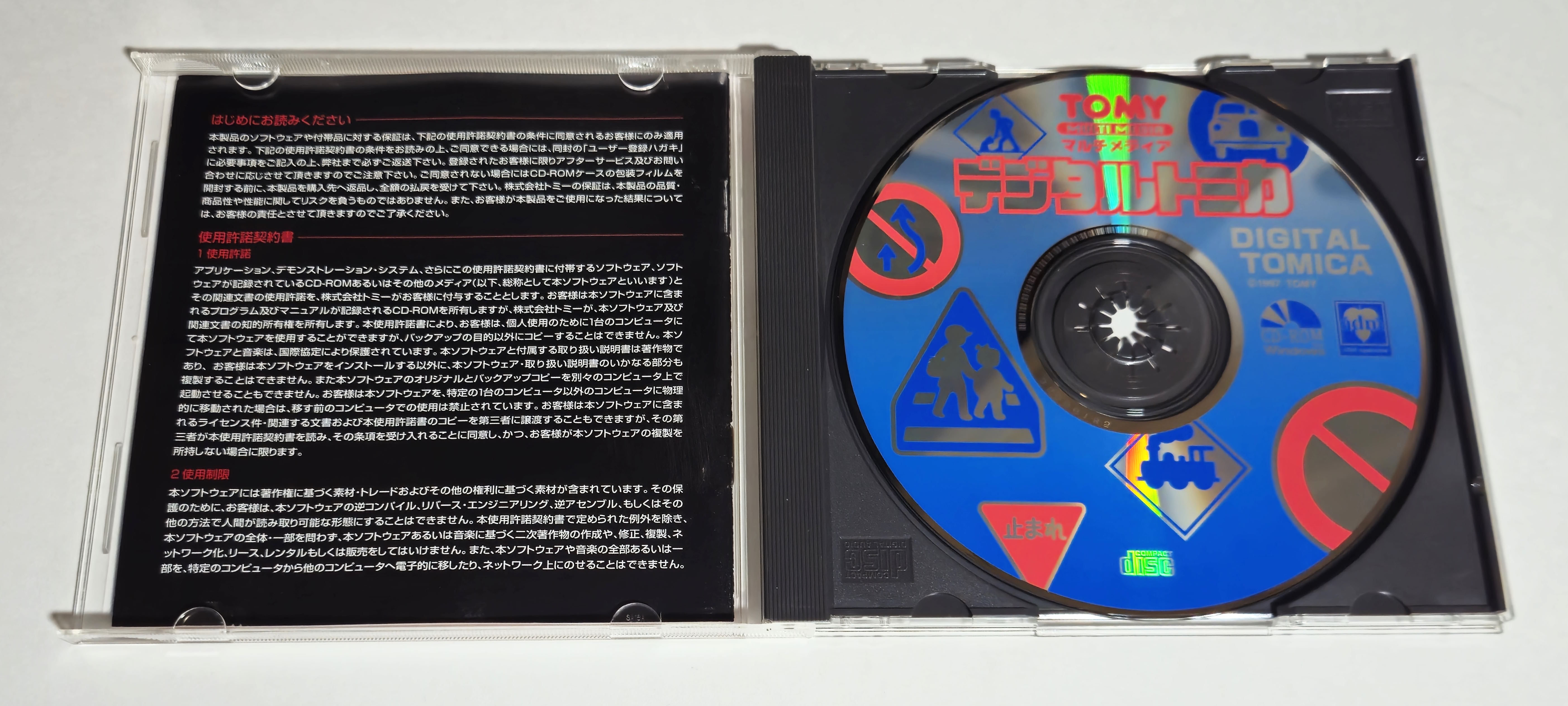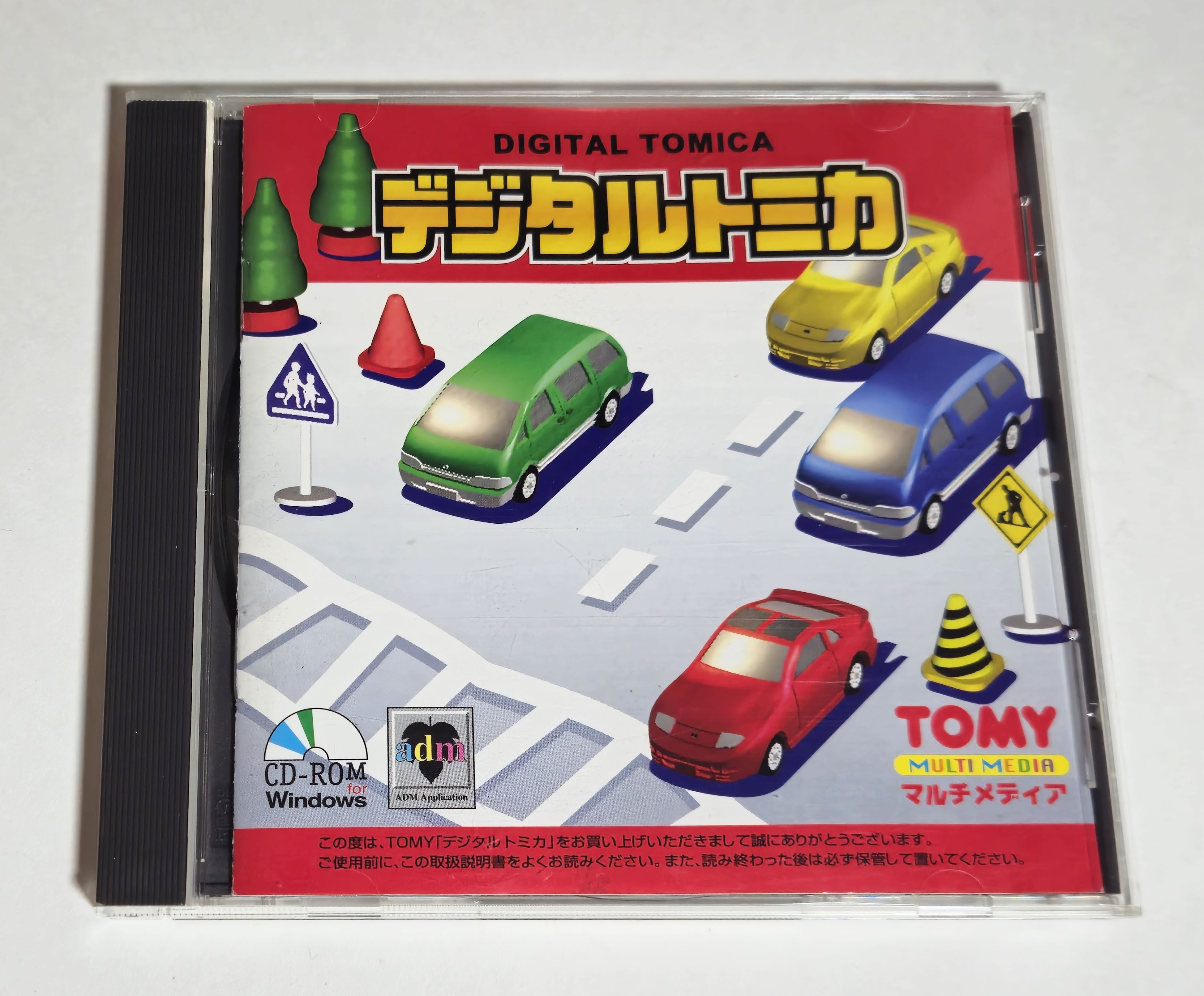 The initial Digital Tomica release was in April 1997 for Japanese-language Windows 3.1 and 95. The disc comes in a CD jewel case originally sold in a larger cardboard box - the first (and only?) run of 10000 copies included a silver Nissan Skyline. I don't currently own the larger cardboard box or Tomica car, just a few copies of the CD in its jewel case.