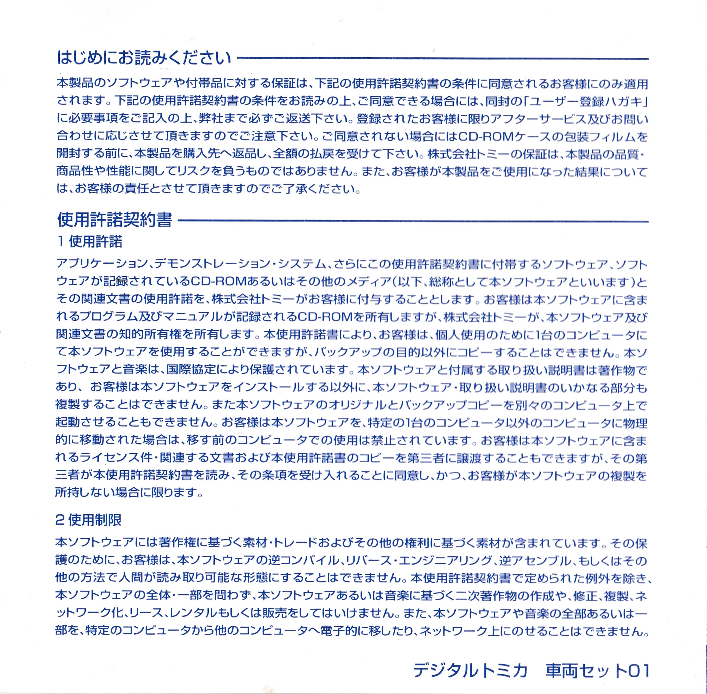 Digital Tomica (デジタルトミカ) was the Tomica counterpart to the Digital Plarail games released by Tomy for Windows 3.1, 95, and later NT in the later 1990s and into the early 2000s. The original 10,000 run of Digital Tomica came packaged with a silver-plated Nissan Skyline GTR Tomica with Digital Tomica text. This release and car can be seen on this website. In addition to being able to plan out combined Tomica and Plarail layouts with both games installed, one vehicle expansion pack and a building pack that also included Digital Plarail elements were also released, and both games were combined and rereleased as Digital Plarail & Tomica DX in 1998.